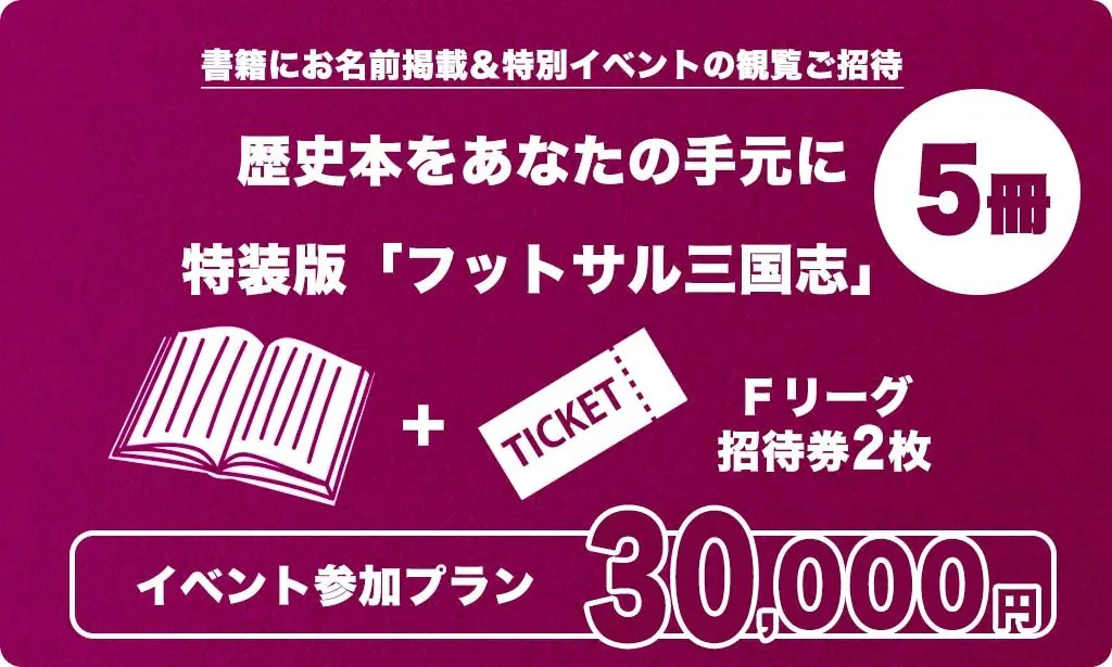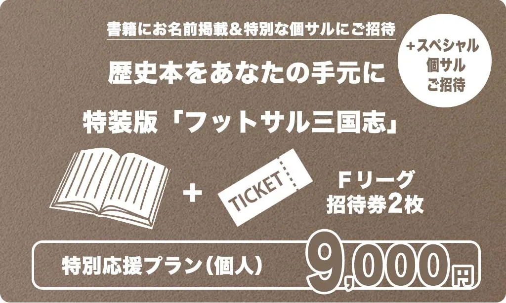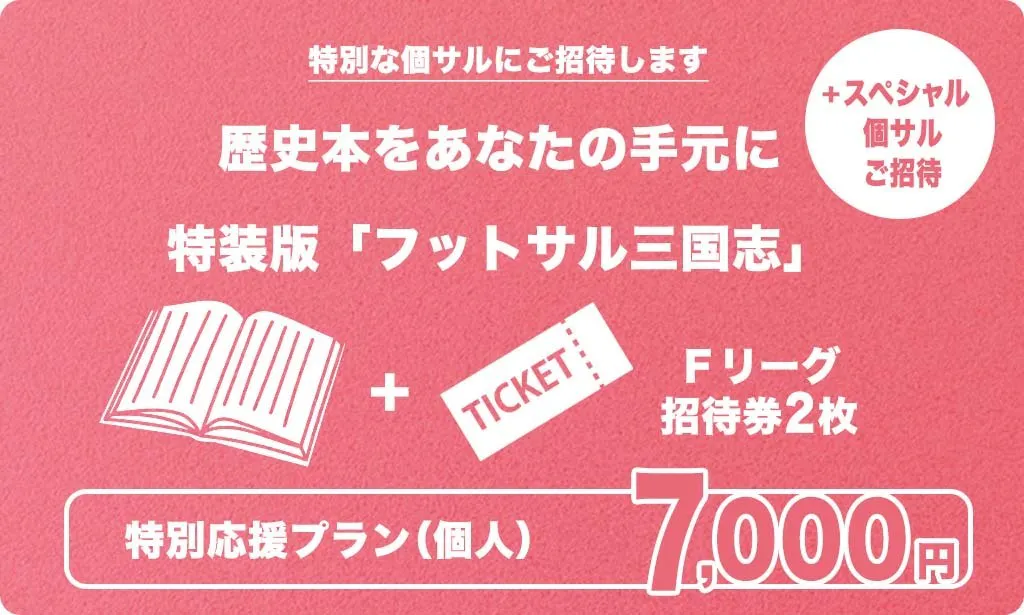 7,000円の支援をいただいたフットサル施設利用者には、リターンとしてフットサル三国志1冊と、Fリーグの招待券、そして有名選手(OB選手を含む)がコーディネートするフットサル施設での個人参加型フットサル(個サル)招待券の配布を準備しています。備考欄に、好きな、あるいは興味のあるFリーグクラブ名と、普段から活用するフットサル施設や活動エリアをご記載ください。