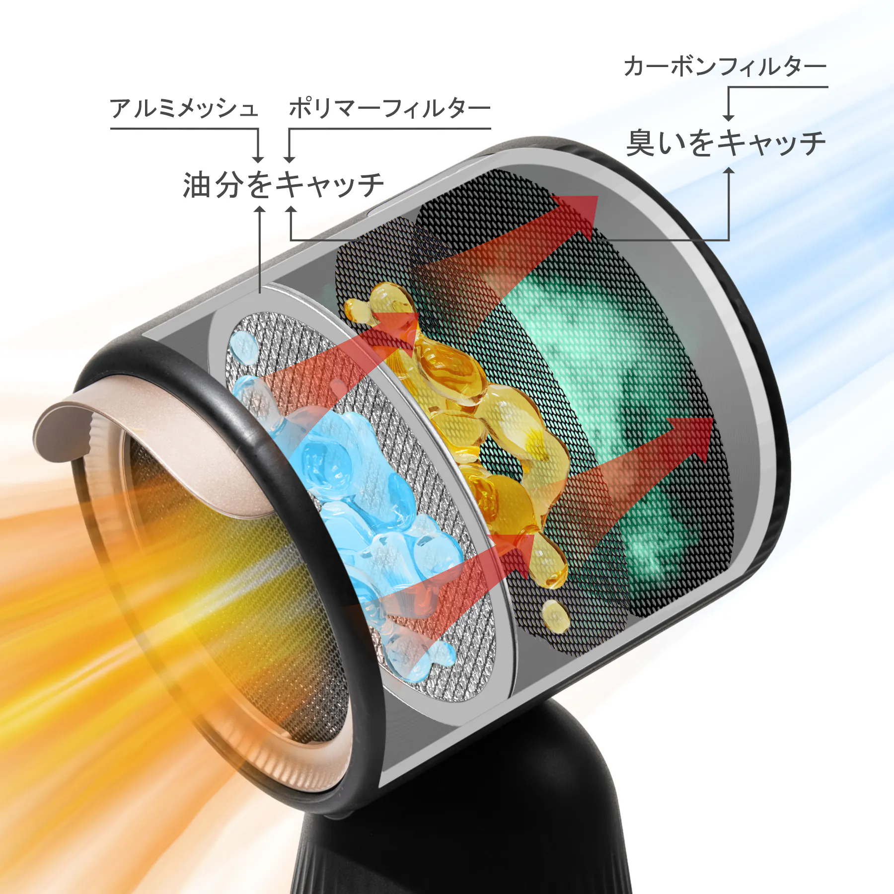 アルミメッシュと微小なポリマーフィルター、カーボンフィルター3層の立体構造で汚れた空気をろ過、室内空気を快適に保つ。アルミ製メッシュが油けむりを冷却し、ポリマーフィルターが油を絡め取り、湯気と油を分離させ、3枚目のカーボンフィルター(活性炭フィルター)が残った空気のニオイを吸着します。