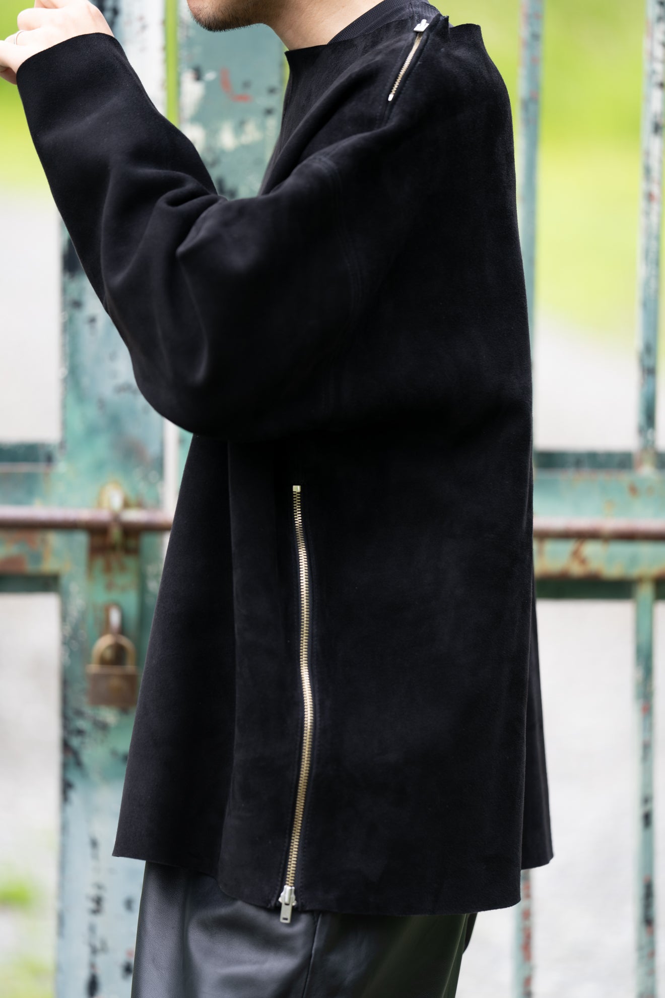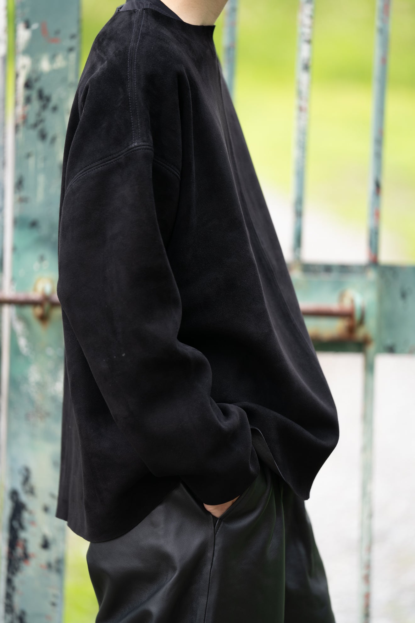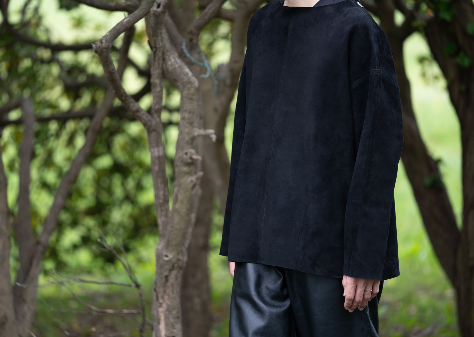 使用している素材はシープスキン(羊革)で、色の深み、革の厚み、しなやかさ、肌触り、耐久性、すべての点にこだわり、時間をかけて厳選いたしました。「革」という特性を生かし、素材を切りっぱなしで縫製することで適度なドレープ感を出し、レザーでありながらカットソーやスウェットシャツと近い感覚で着れるバランスを追求しました。夏場には向きませんが湿度を適度に吸収しながら風通しを防ぐ特性を持つため20度以下の外気温では快適に着用できます。