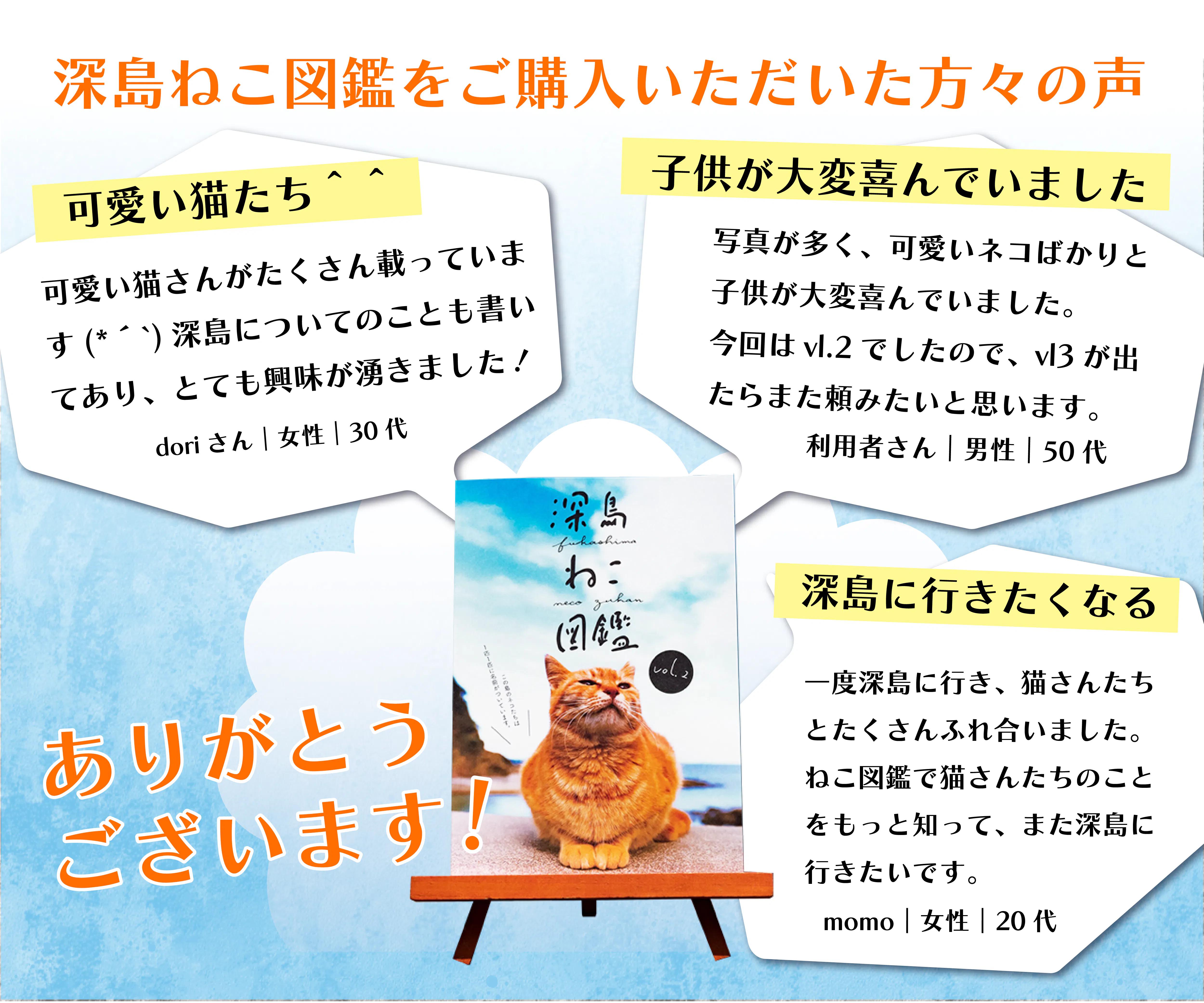 2024/07/03 21:04お久しぶりです。先日、やっと!ねこ図鑑が完成し、深島に届きました♪今回の表紙、誰かわかるかなー??中身もチラ見せvol.3は新たに性格などを5段階であらわしたチャートがついています。島に来てねこたちと触れ合うときに「警戒心」などをみてもらえると、触れ合えるねこなのかどうかがわかります◎また、ねこ図鑑デジタルでは、もっと詳しい居場所や性格、なかよしさんたちもご紹介しています。デジタルは1,100円ですが、本のQRコードから入ると半額になりますので、お手元にねこ図鑑vol.3が届いたら、ぜひデジタルもご活用くださいね♪リターンのお品は来週発送予定です。今しばらくお待ちください。 もっと見るお礼!!!