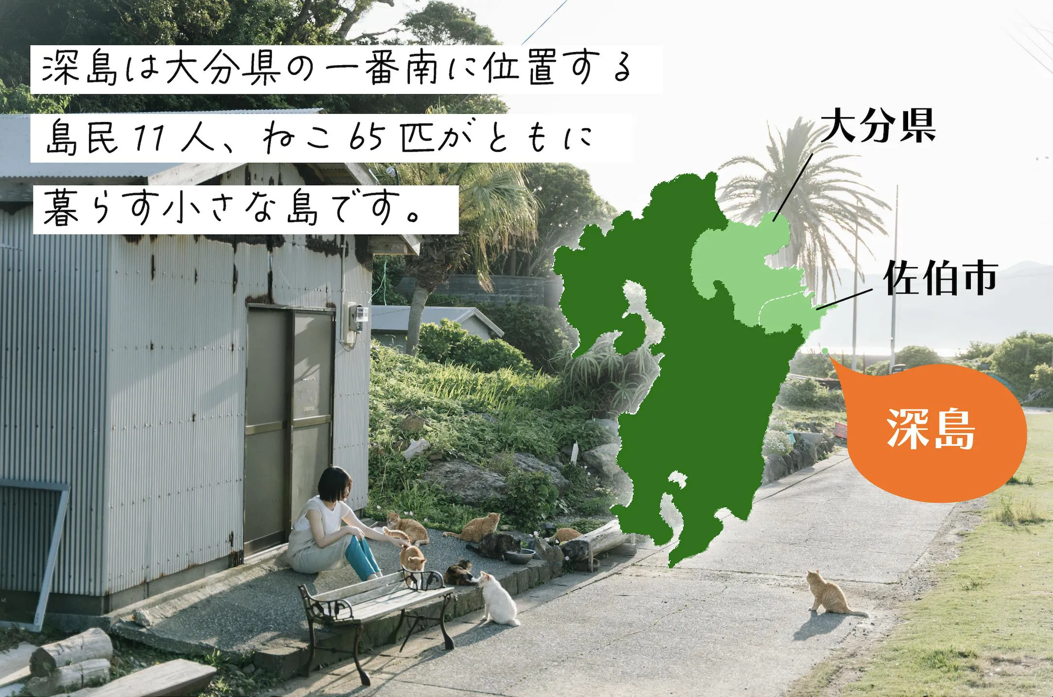 深島は大分県の一番南、佐伯市蒲江から船でおよそ30分のところにある、島民11人と65ひきのねこがともに暮らす小さな離島です。