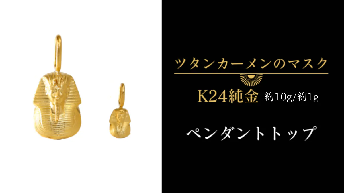 また、古代エジプトシリーズという事で「純金のツタンカーメンのマスク」もご用意しました。こちらも純金製で、約1gの極小サイズから、77gまでの6サイズ展開です。