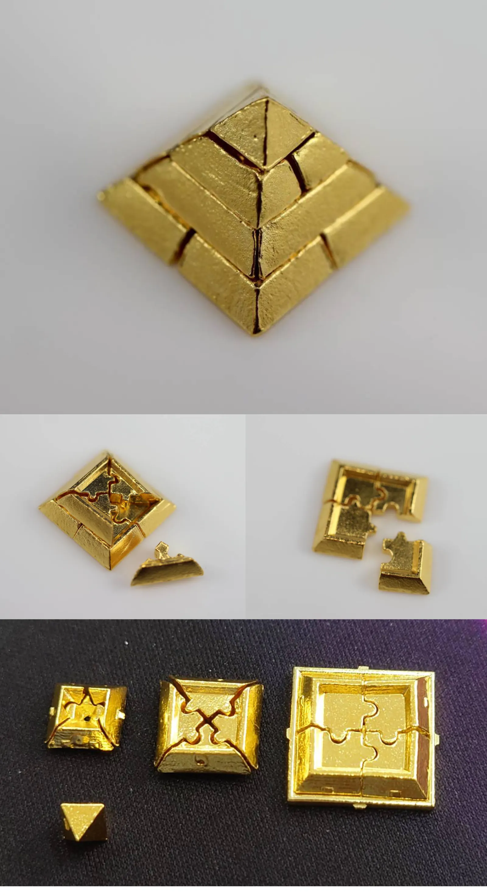 ピラミッドのサイズは2種類。12ピースのピラミッドは約1gのパーツが12個で、合計で約12gです。さらに、極小サイズのかわいい1gのピラミッドもあります。(約1gのピラミッドはパズルではありません)