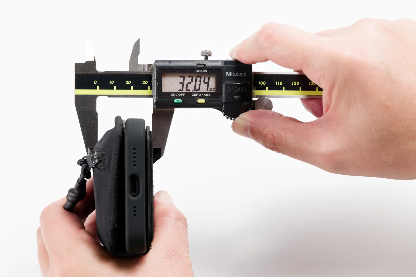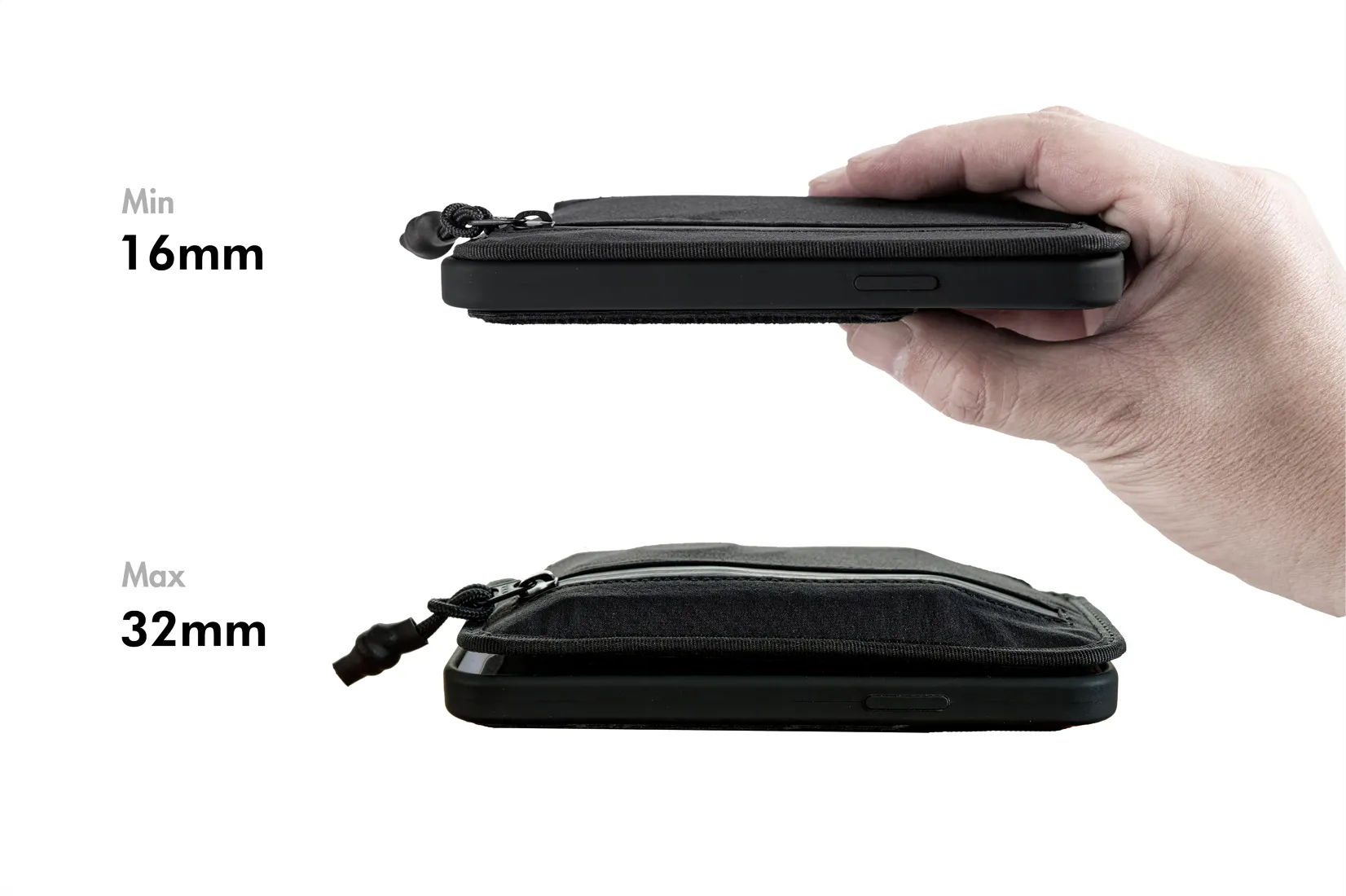 実使用レベルでも厚さ23mm(カード 5枚、紙幣5枚、コイン10枚)なのでポケットに入り、電子決済とあわせてメイン財布としてご利用いただけます。さらに薄さを追求するとカードは2〜3枚、紙幣1枚、小銭を入れない場合、厚さ20mm程度におさまります。そもそも厚い製品では体感できない、収納量に応じて厚さが変化するスリムかつ大容量の財布一体型はWrapupだけ!