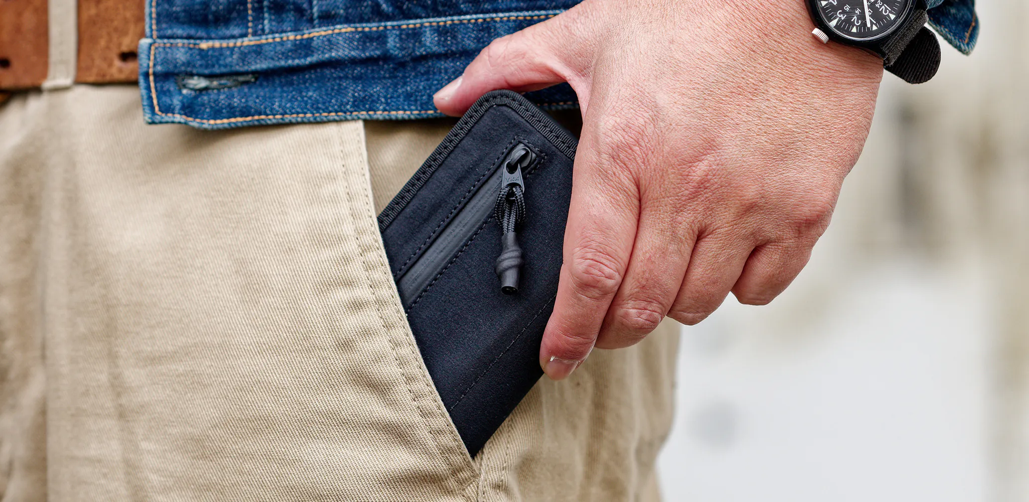 OLDタイプ(iPhoneXS/X/12)ではポケットの開口部を面ファスナーで閉じることにより、収納物の落下を防止する仕様でした。面ファスナーを1面大胆に配置し意匠としての特長と機能性を図りご好評をいただきましたが、一部ユーザーより、「カッコいいけど剥がす時の音が気になる」「べりべり音がオフィスでは使いずらい」という声がありました。また、耐久性という点で開口部の開け閉めを繰り返すことで面ファスナーの密着力が低下してしまう、ということもあり、NEWタイプ(今作)ではポケットの開口部をファスナーで閉じるシンプルな構造に変更しました。これによりユーザーが気にされていた「べりべり音」と面ファスナーの耐久性、2点が改良されました。