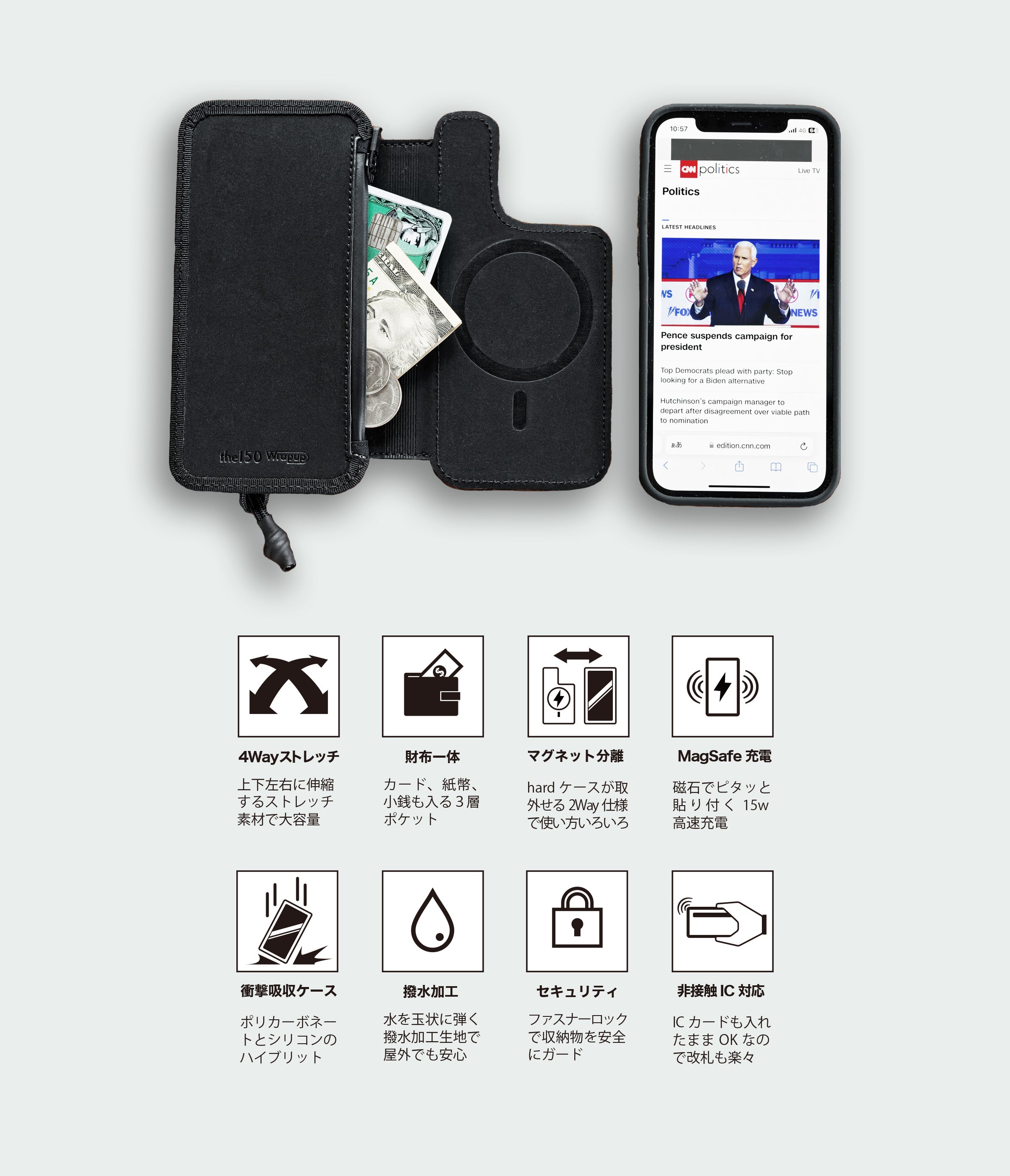 Wrapupは、この難題を解決し「薄さ」「大容量」どちらも兼ね備えた、私たちthe150の代名詞ともいえる財布一体型iPhoneケースです。