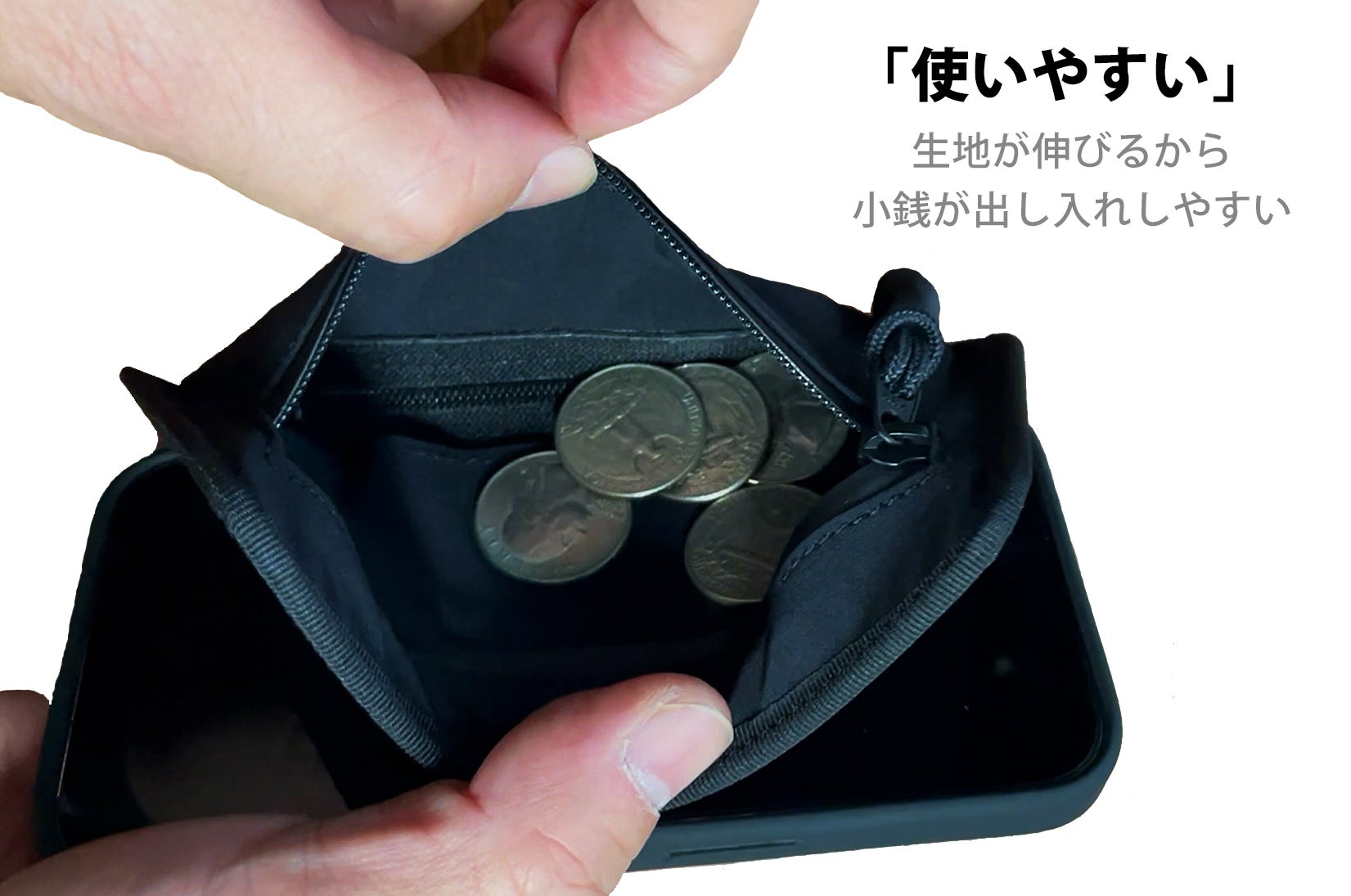 伸縮するから小銭を簡単に取り出せる!