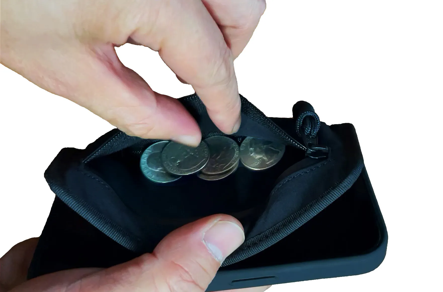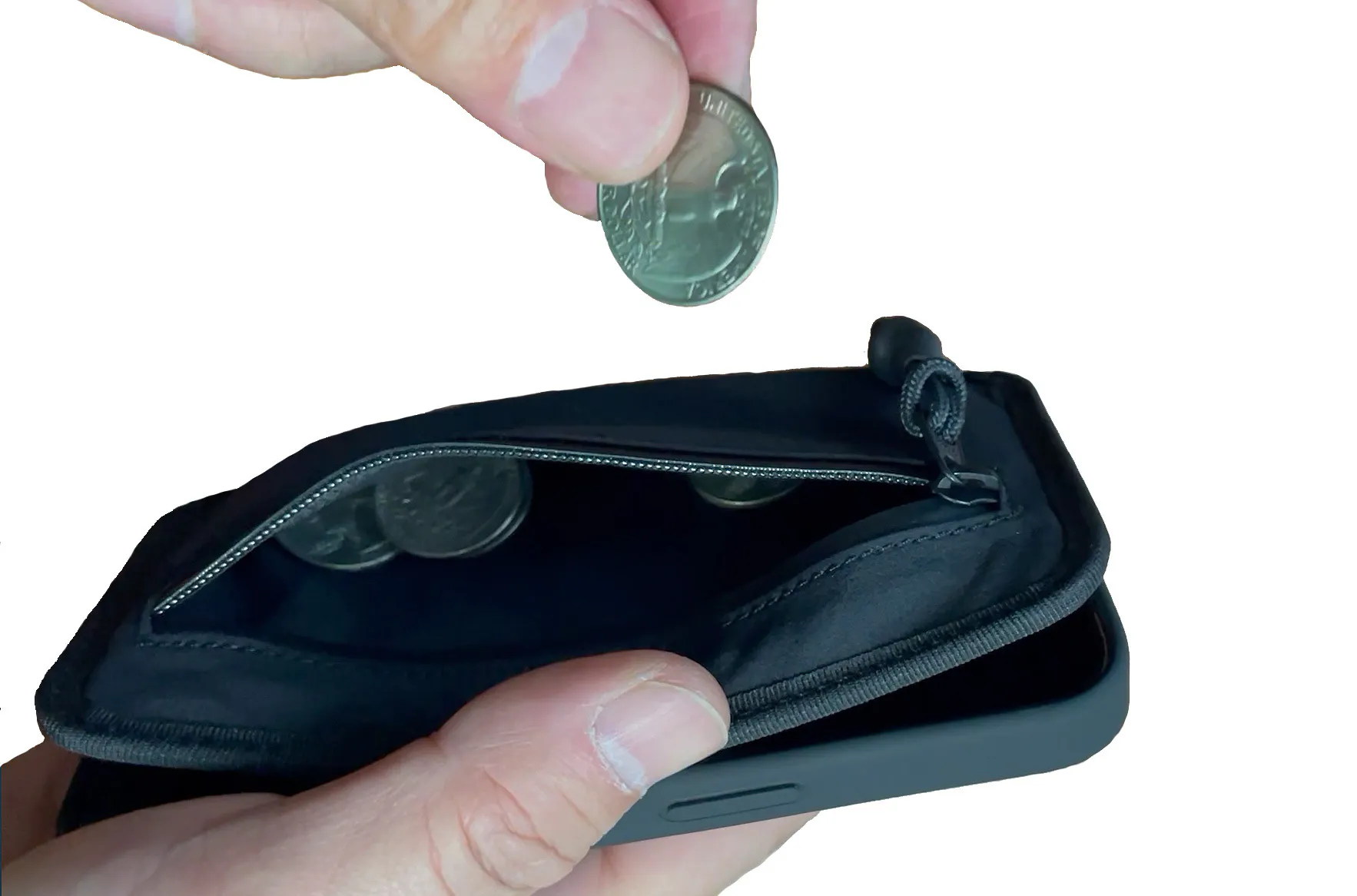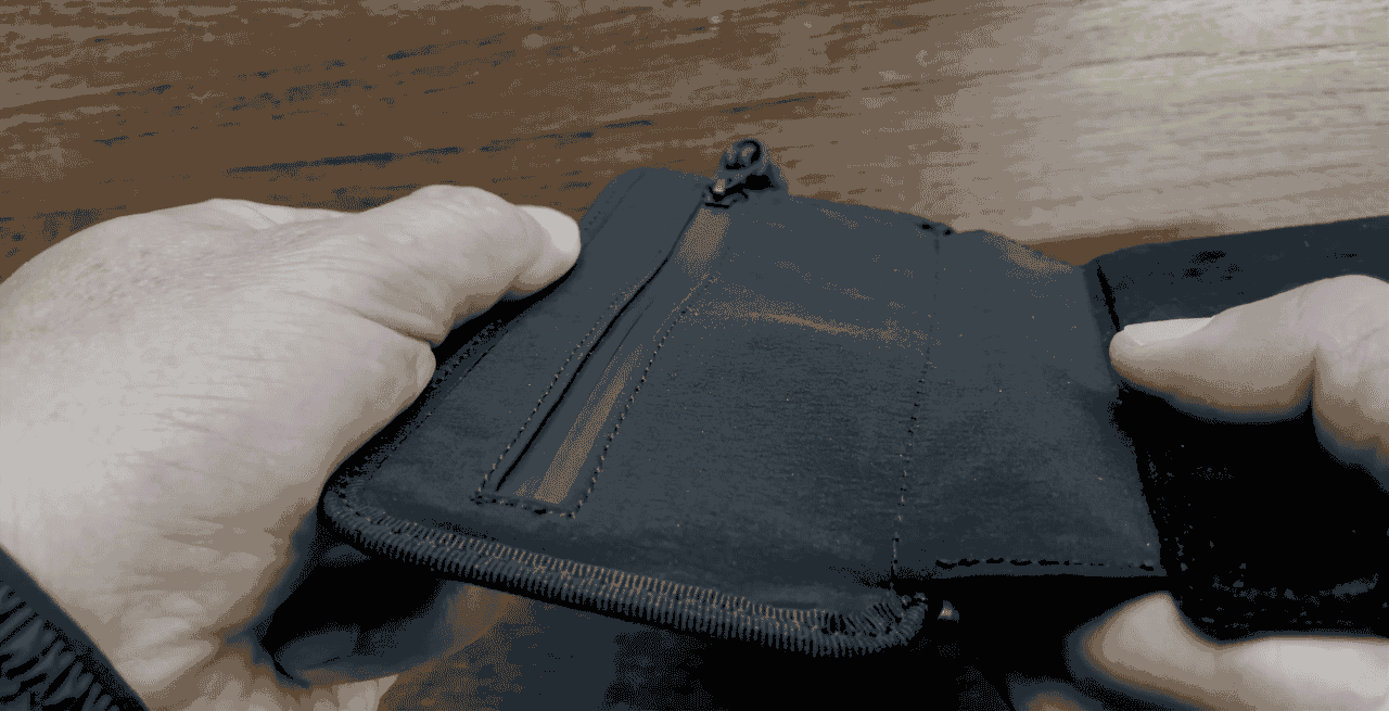 Wrapupは表面のファスナーを開き開口部を広げると、伸縮性の素材により伸びながら広がります。ポケットの中身がよく見えて、サクッと小銭の出し入れが可能です。