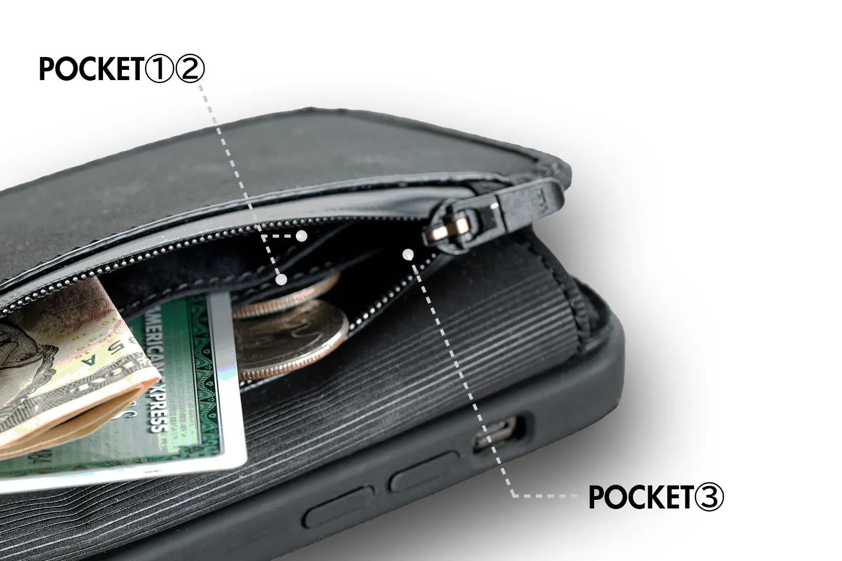 財布一体型の多くは、小銭の収納スペースはあるが製品が厚いものや、カード類は収納できるけど小銭の収納スペースがなく製品が薄いものになります。小銭も入れたいけど分厚いケースは持ちたくないから財布一体型のケースを諦めている方は多いのではないでしょうか。