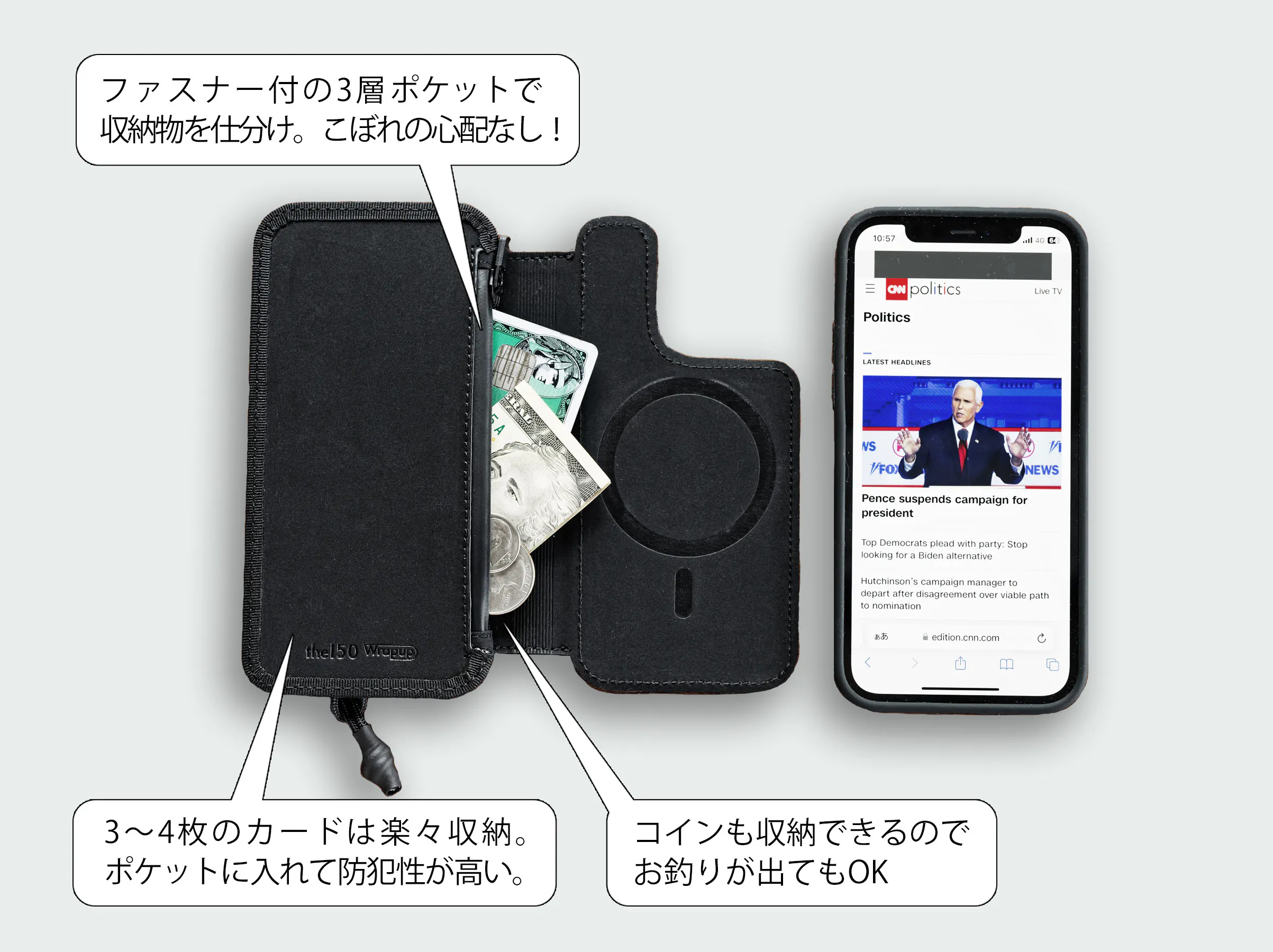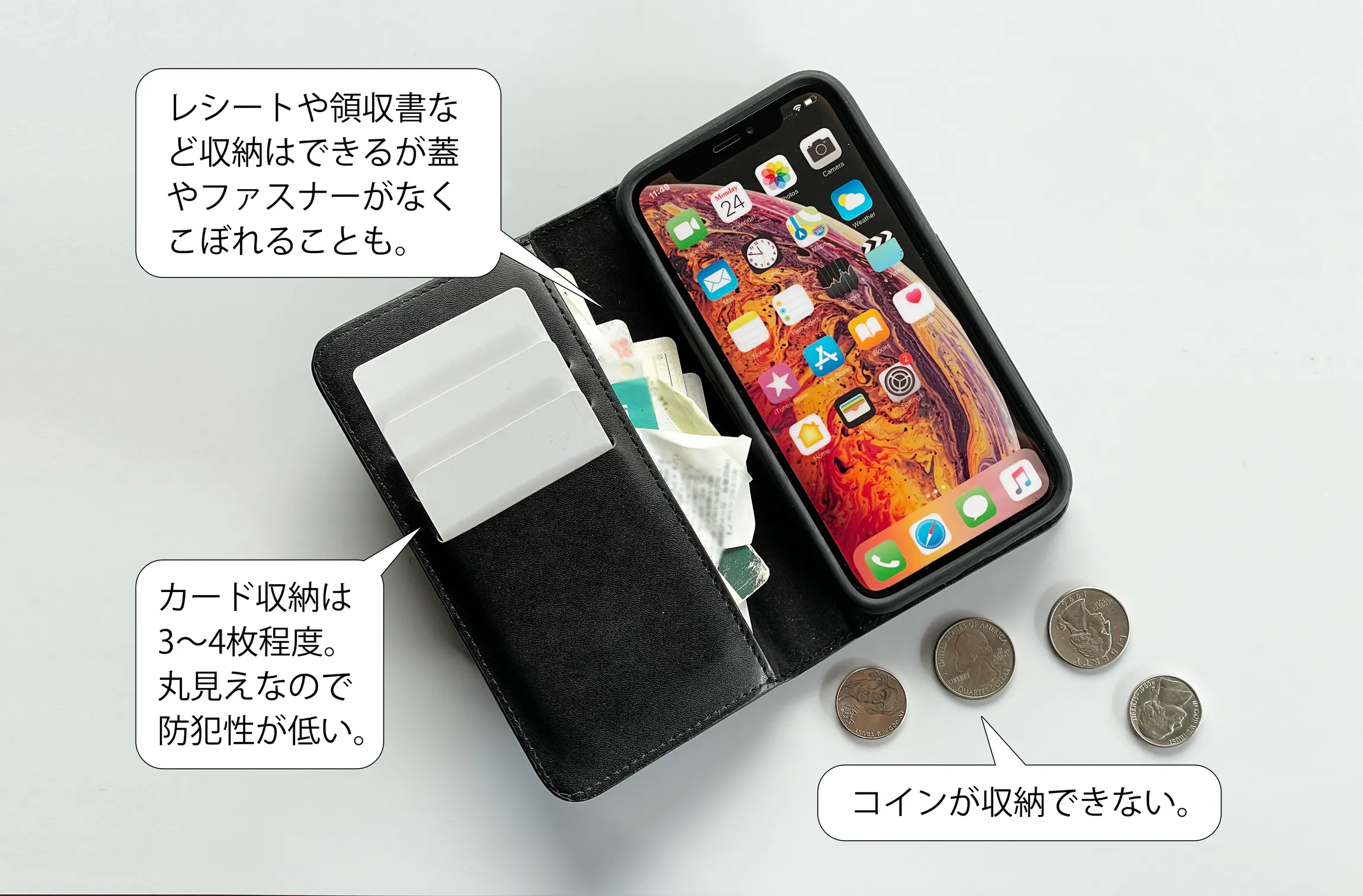 一般的な手帳型ケースと比べ、「収納物の落下防止」「コインの収納」「防犯性」の点でもWrapupは優れております。