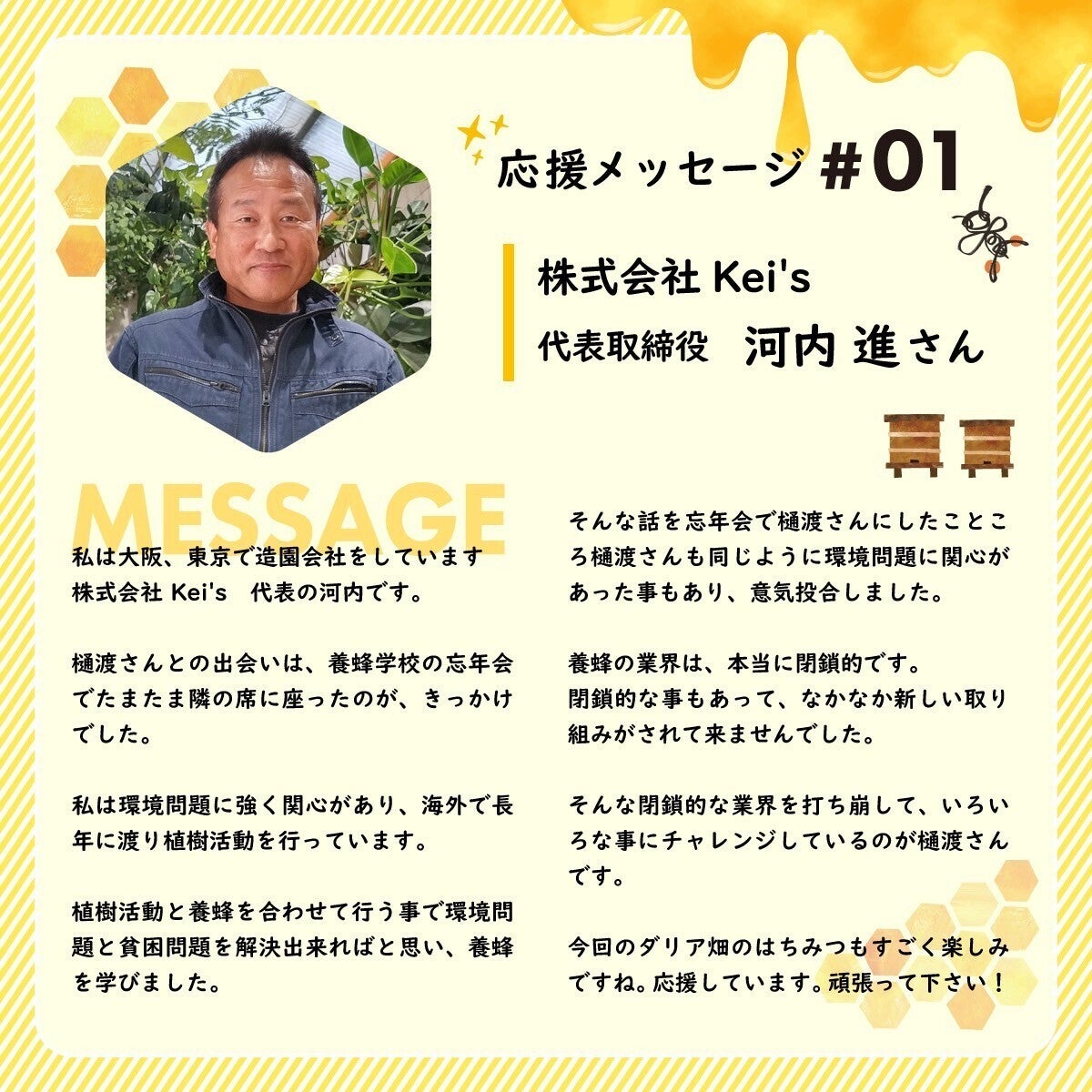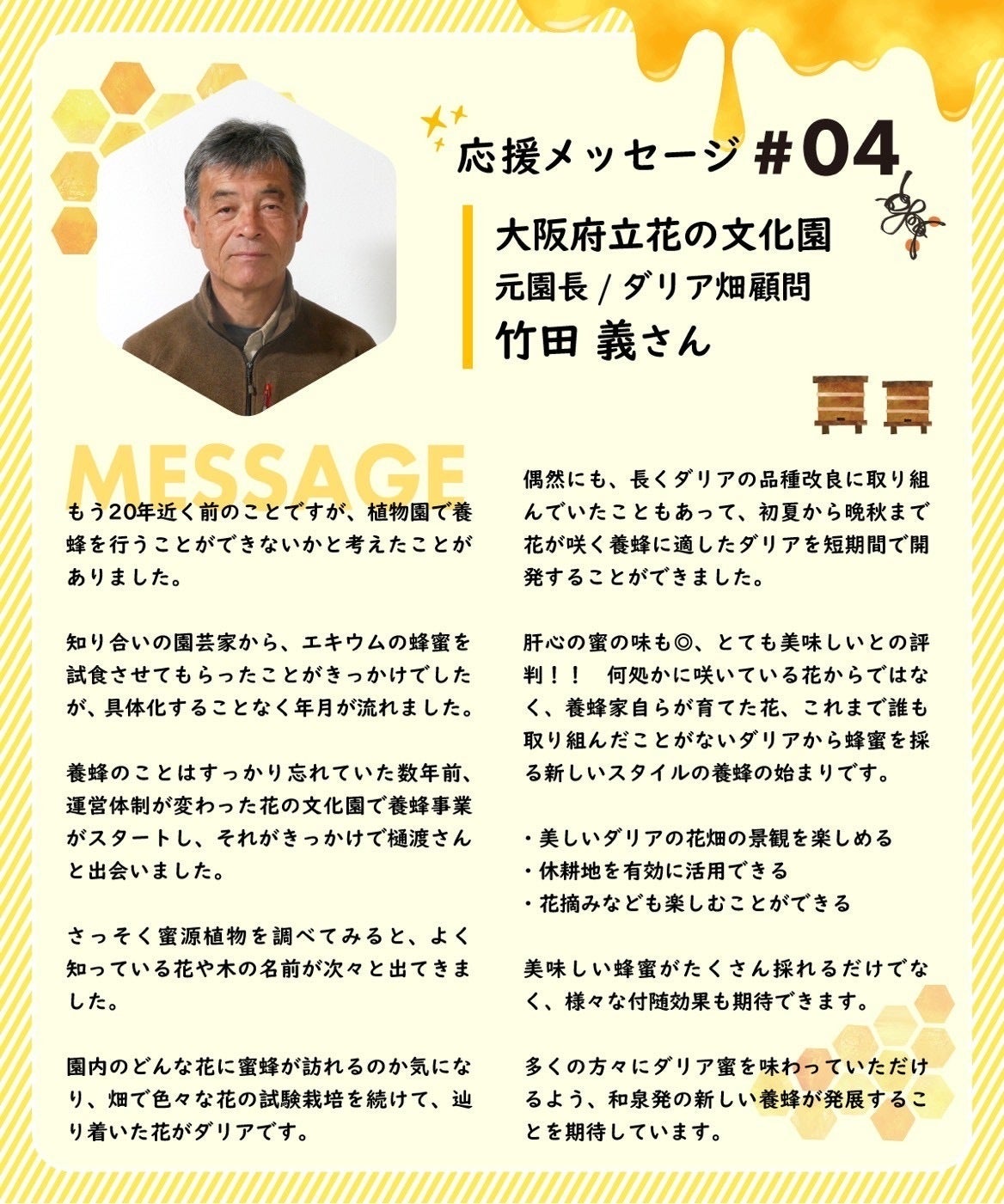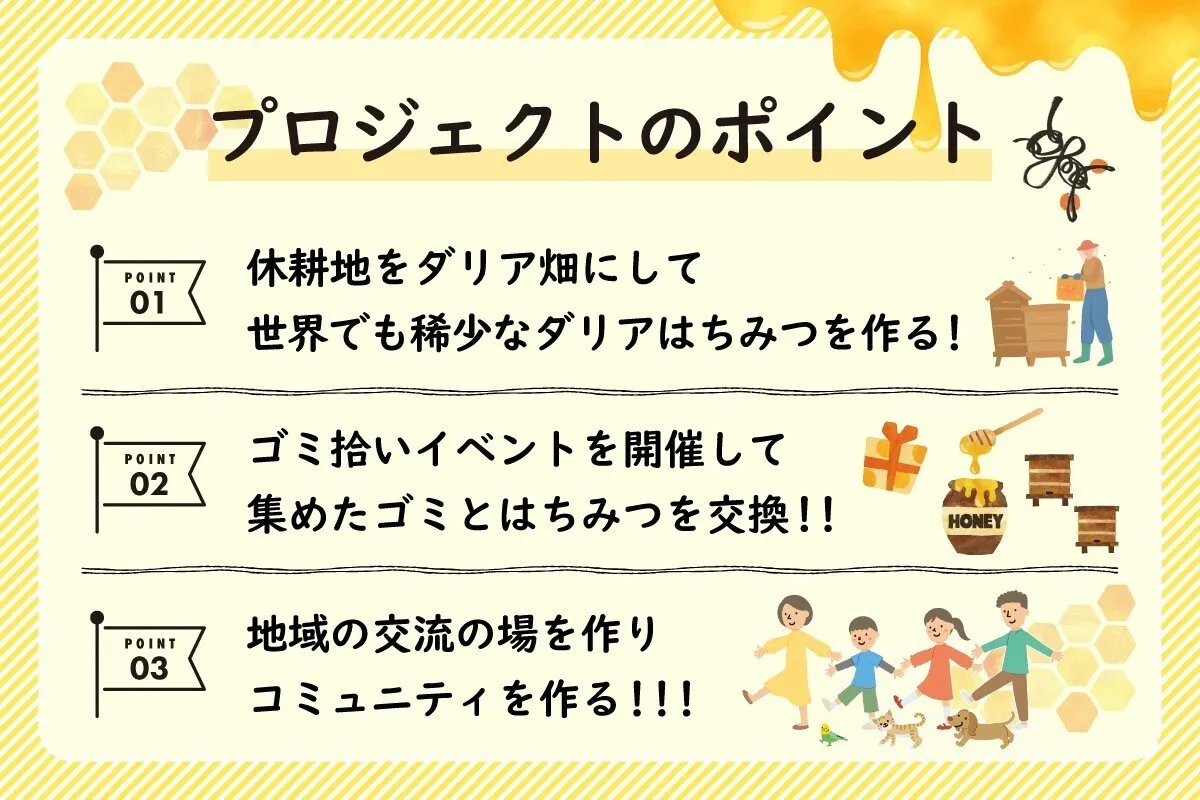 このプロジェクトは、自然の減少に歯止めをかけ、特にミツバチの役割を再認識することを目指しています。ミツバチの受粉活動により、生態系はバランスを維持し、我々は食料を生産することができます。プロジェクトを通じて、自然との調和と地域社会の再生を追求し、豊かな未来のための一翼を担いたいと考えています。