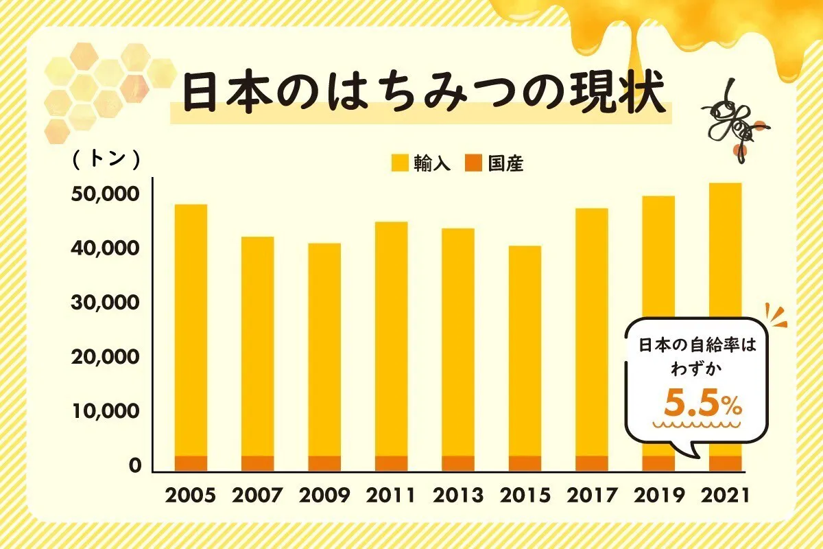 はちみつの輸入量は年々増加傾向にありますが、国産はちみつの生産量は増えていません。はちみつの自給率は何と5.5%