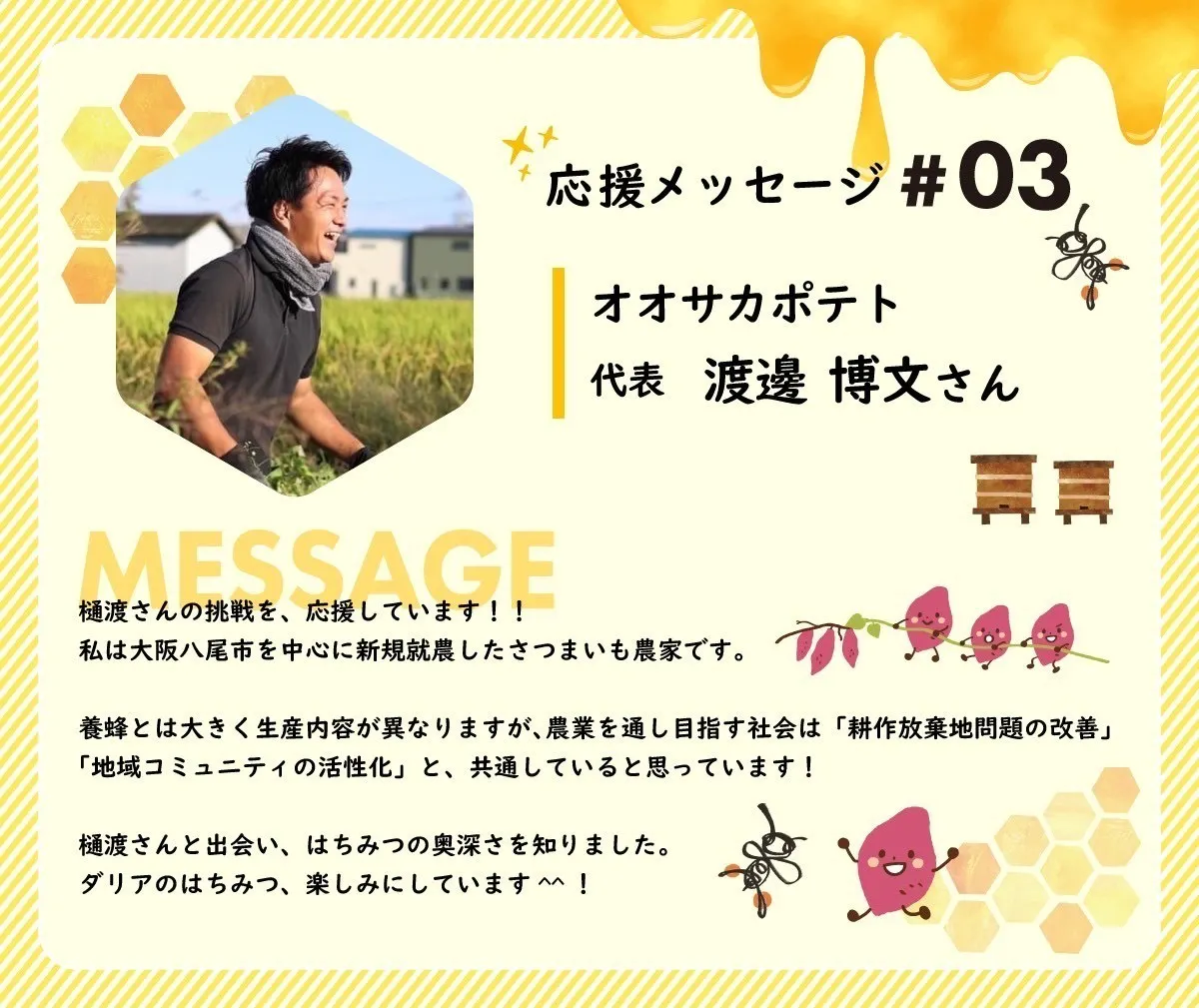 そんなときに、ミツバチの生態の話を聞いて興味を持って学んだら、ミツバチは、はちみつを作るだけでなく生態系の根幹の役割を担っていたことに気づいたんです。僕はそんなミツバチに一種憧れのような気持ちを抱いているんだと思います。彼女たちと共に生きることができて光栄な思いと共に日々、お天道さまの下スタッフさんと汗だくで体を動かしています!