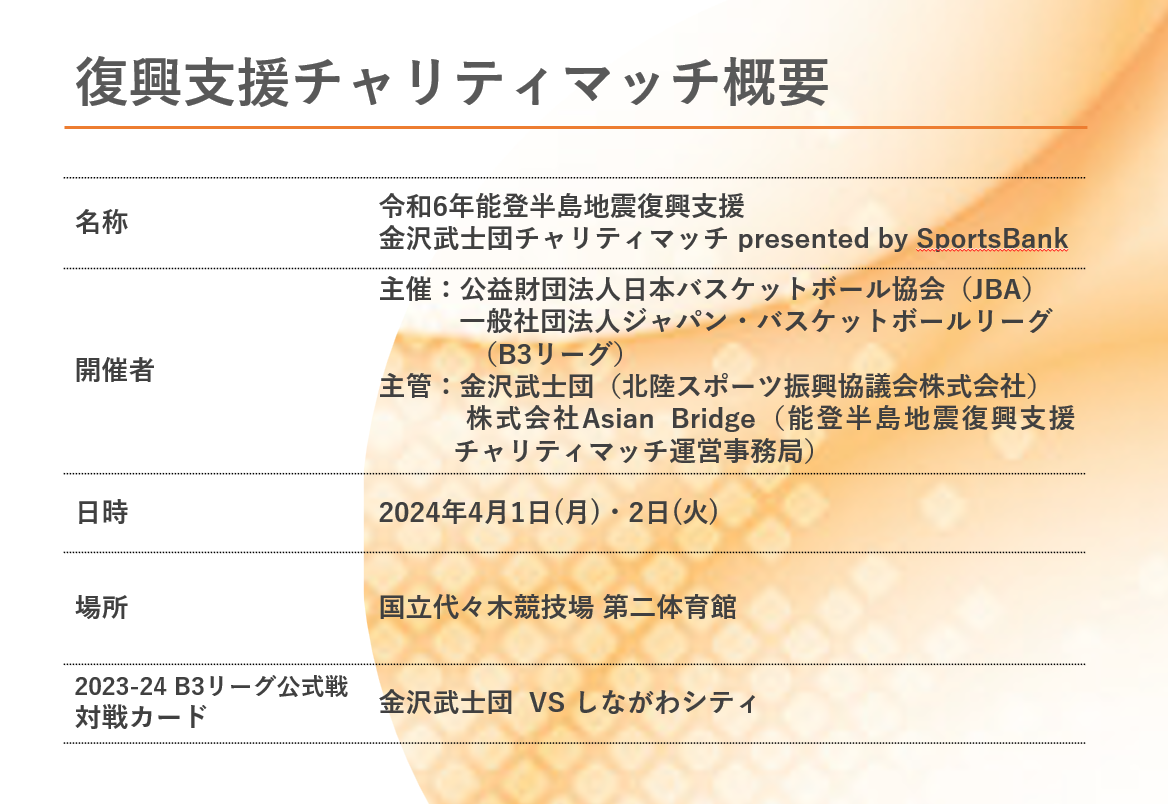 震災を受け、この度、石川県七尾市を本拠地とする男子プロバスケチーム「金沢武士団(カナザワサムライズ)」(B3リーグ所属、北陸スポーツ振興協議会株式会社)と協働し、『令和6年能登半島地震 復興支援チャリティマッチ』を企画、開催する運びとなりました。