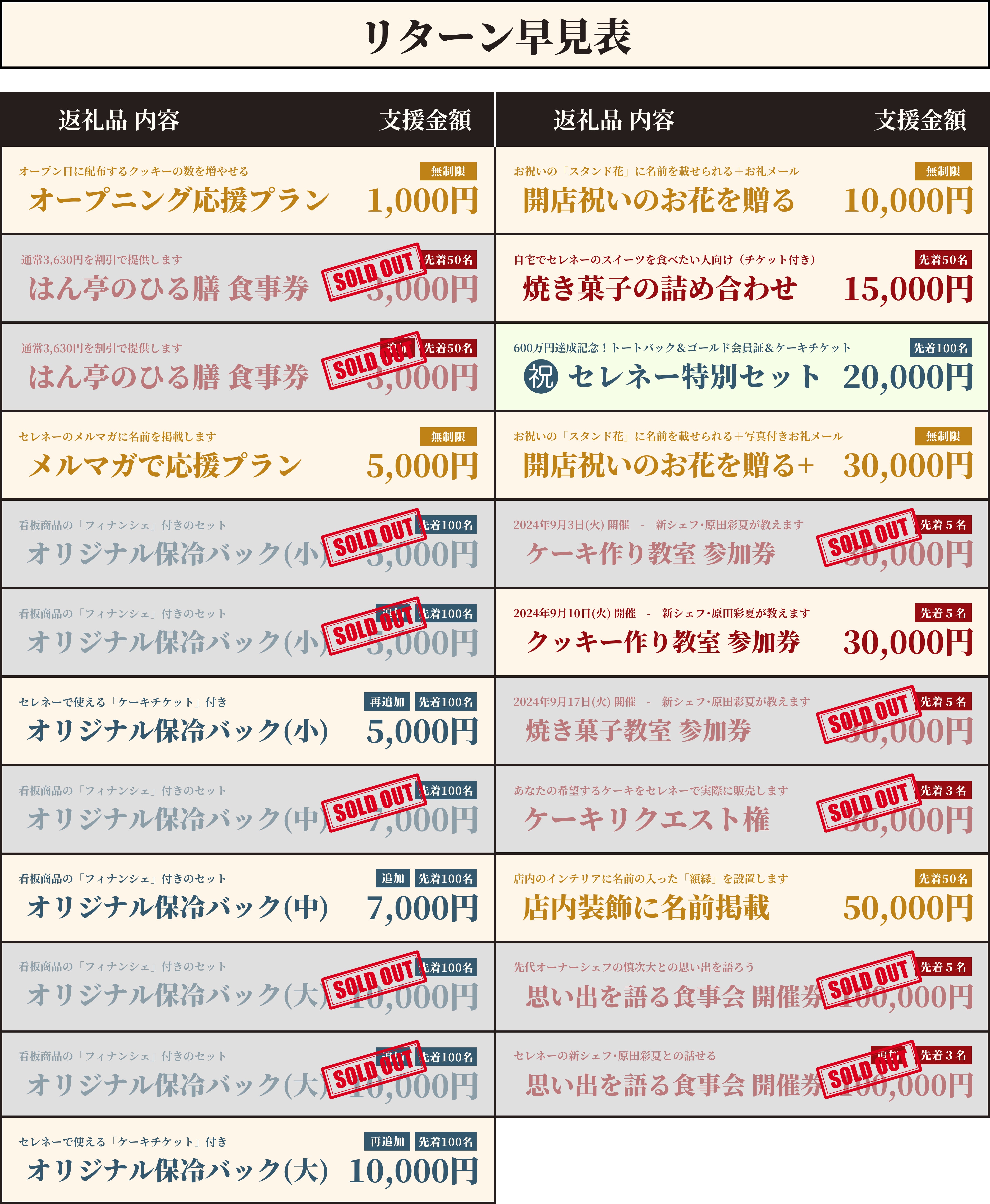 今回のクラウドファンディングでは、洋菓子店『パティスリー セレネー』の再開復活を記念したリターンをご用意しています。気になるリターンを支援購入いただけると嬉しいです。