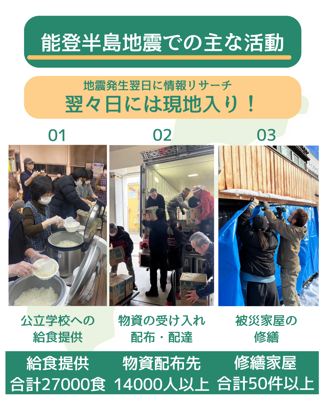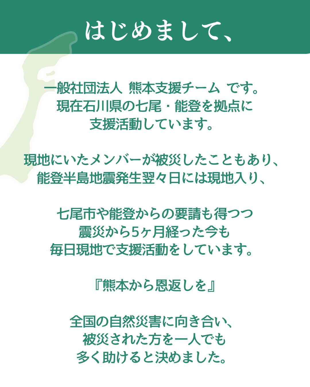 ※今後は「能登半島支援チーム(今回の地震をきっかけにできた地元メンバーを主体とするチーム)」の活動を全面サポートする形で被災地に関わります。