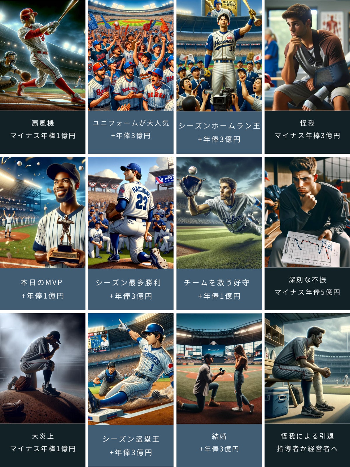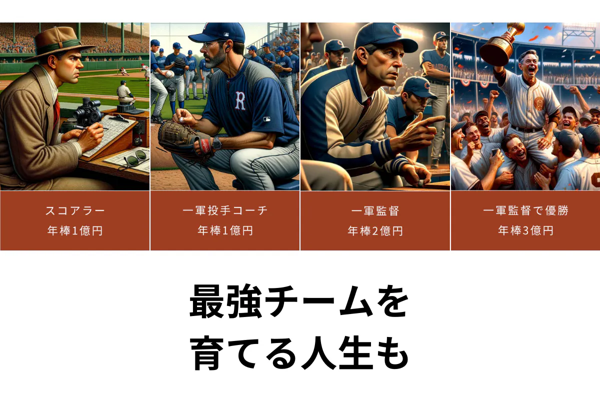 このゲームは、選手になったり、コーチになったり、球団オーナーになったりしながら、「野球」に関わる職業を通じて、お金を稼いでいきます。選手として大成しなくても、思わぬ大逆転があるかも知れません。