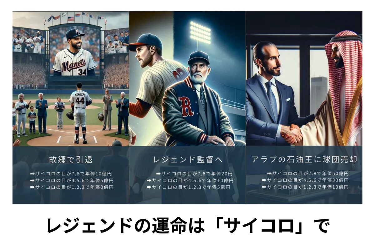 ➡サイコロの目が7.8で年俸10億円 ➡サイコロの目が4.5.6で年俸5億円 ➡サイコロの目が1.2.3で年俸3億円