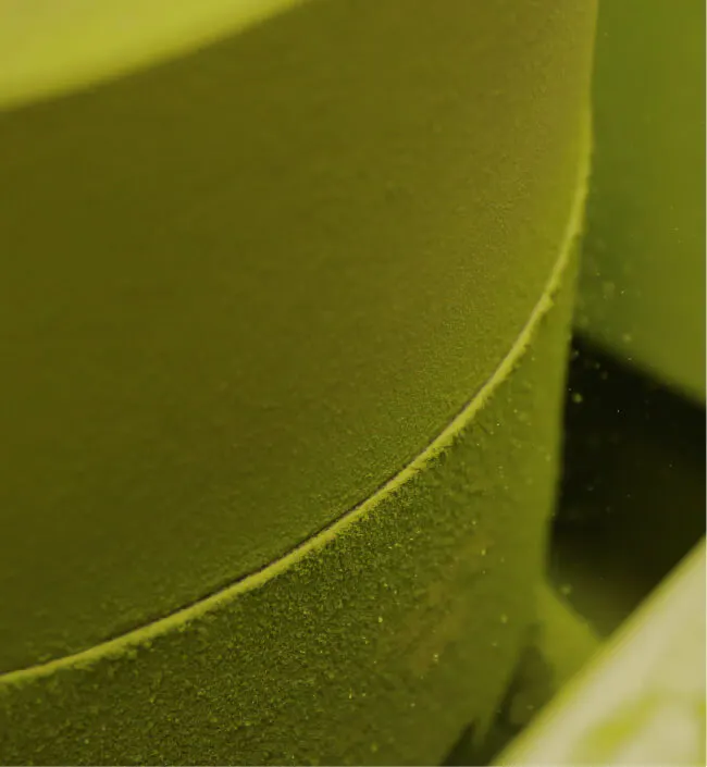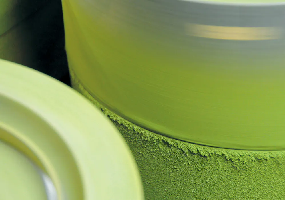 【挽き:石臼で時間をかけて丁寧に挽きます。(※全抹茶配合量の50%以上が石臼挽き)】