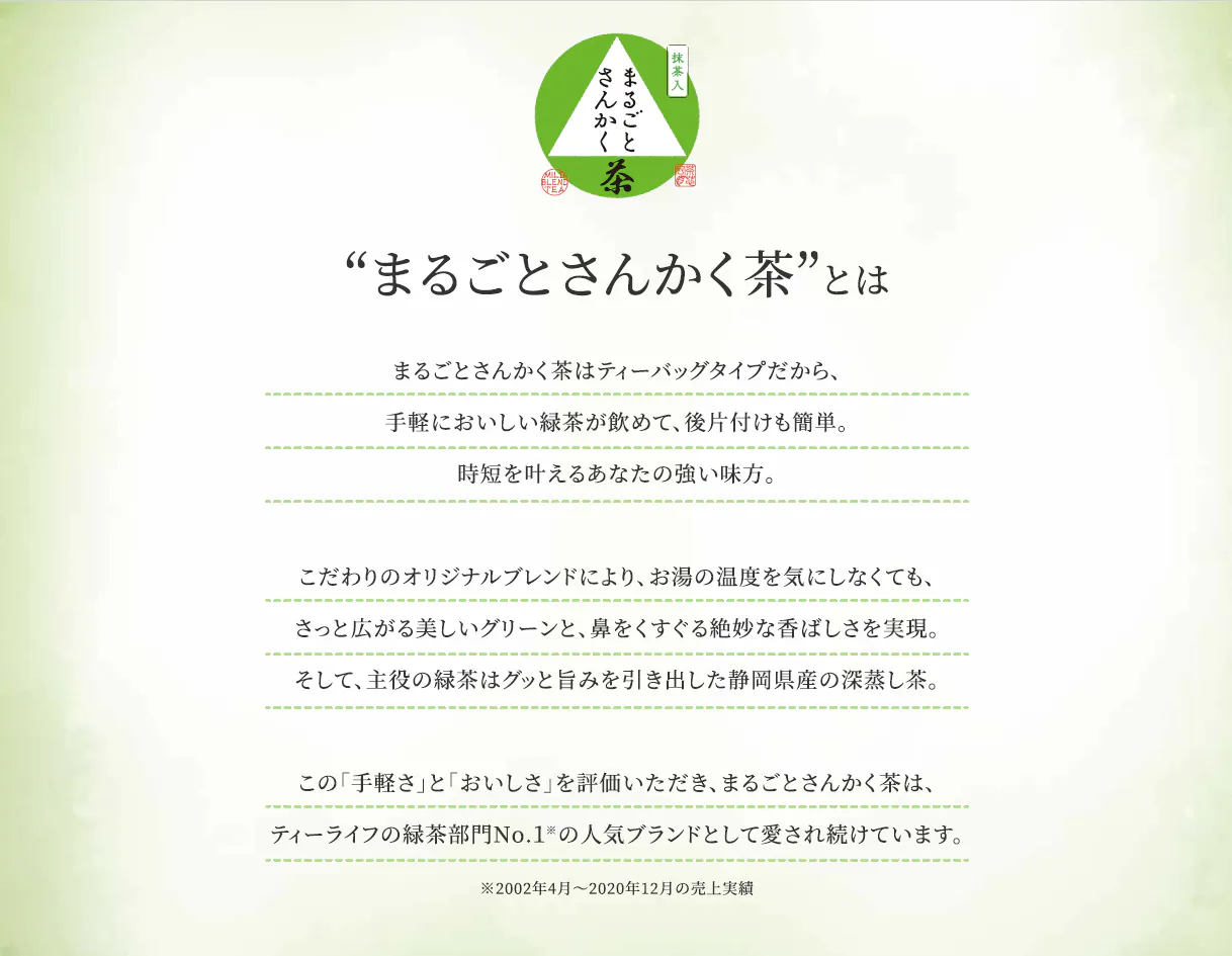 今回ご紹介する「まるごとさんかく茶」は、ティーライフ緑茶部門No.1のお客様からうれしいお声をたくさんいただくファンの多い商品です。