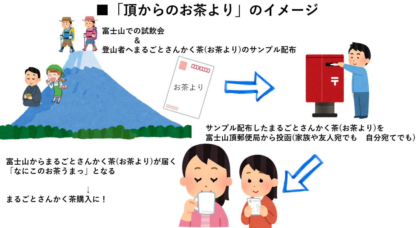 お茶よりを登山者の方に配布し、登山者の方は登頂したら富士山頂郵便局から大切な方や友人(もちろん自分宛てでも)に向けてお茶よりを投函していただきます。