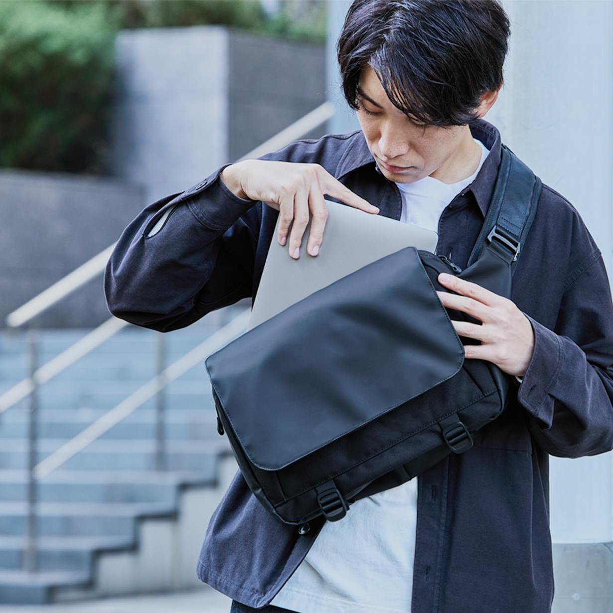ずっと綺麗に使える高耐久のスリングバッグで、PCを快適に持ち出せます。