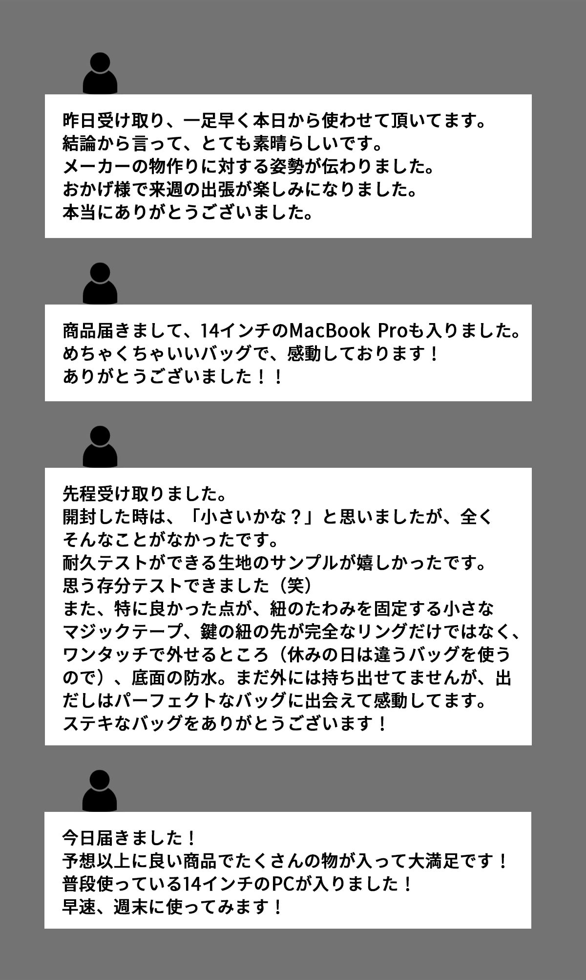 私自身頂いた声を拝見するまでは、PCを持ち運ぶバッグはリュックという固定観念があり、「スリングバッグにPCを収納できる事が求められている」という事すら分かりませんでした。