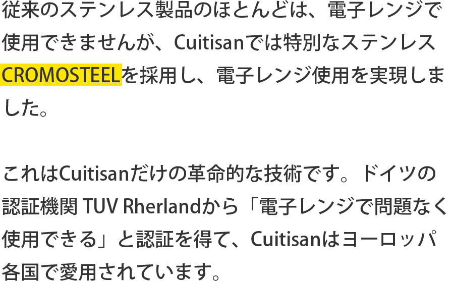 素材:レンジで使える特別なクロモスチール。ステンレス素材