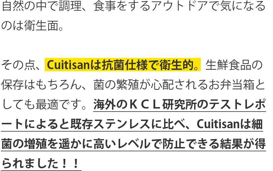 検査実施時期2020年4月(韓国内での検査)検査結果:Cuitisanステンレスは細菌Aをほとんど除菌し抗菌する効果を得ました。一般的なステンレス比べ、はるかに高い抗菌効果です。