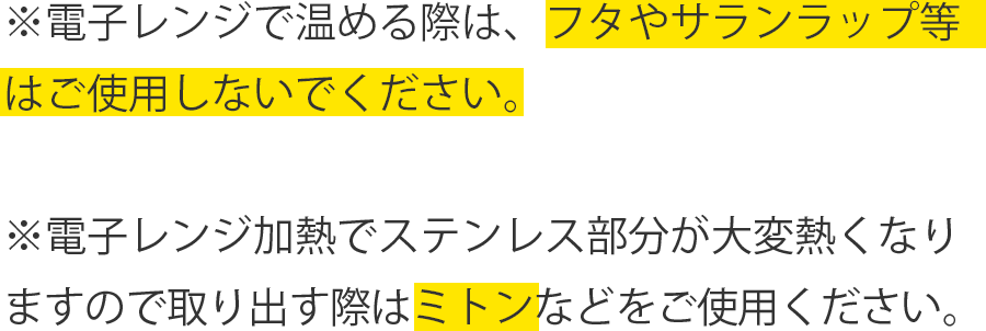 ・電子レンジの温めの際は、自動の温めボタンやレシピ使わないでください、ワット設定、何分の時間指定でご使用ください。