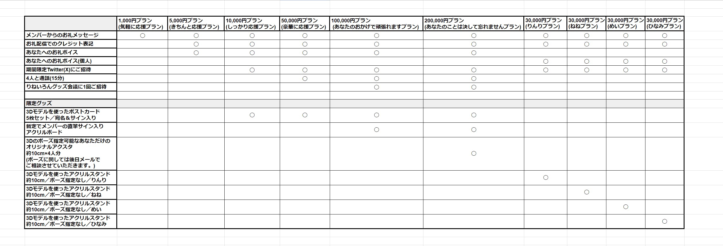 また「期間限定Twitter(X)にご招待」や「RineiroNグッズ会議に参加」など、ユニークなリターンもご用意しました。プライベートなRineiroNメンバーのことを知ることができたり、あなたが考えたRineiroNのグッズが本当に販売されたりするかも……!?
