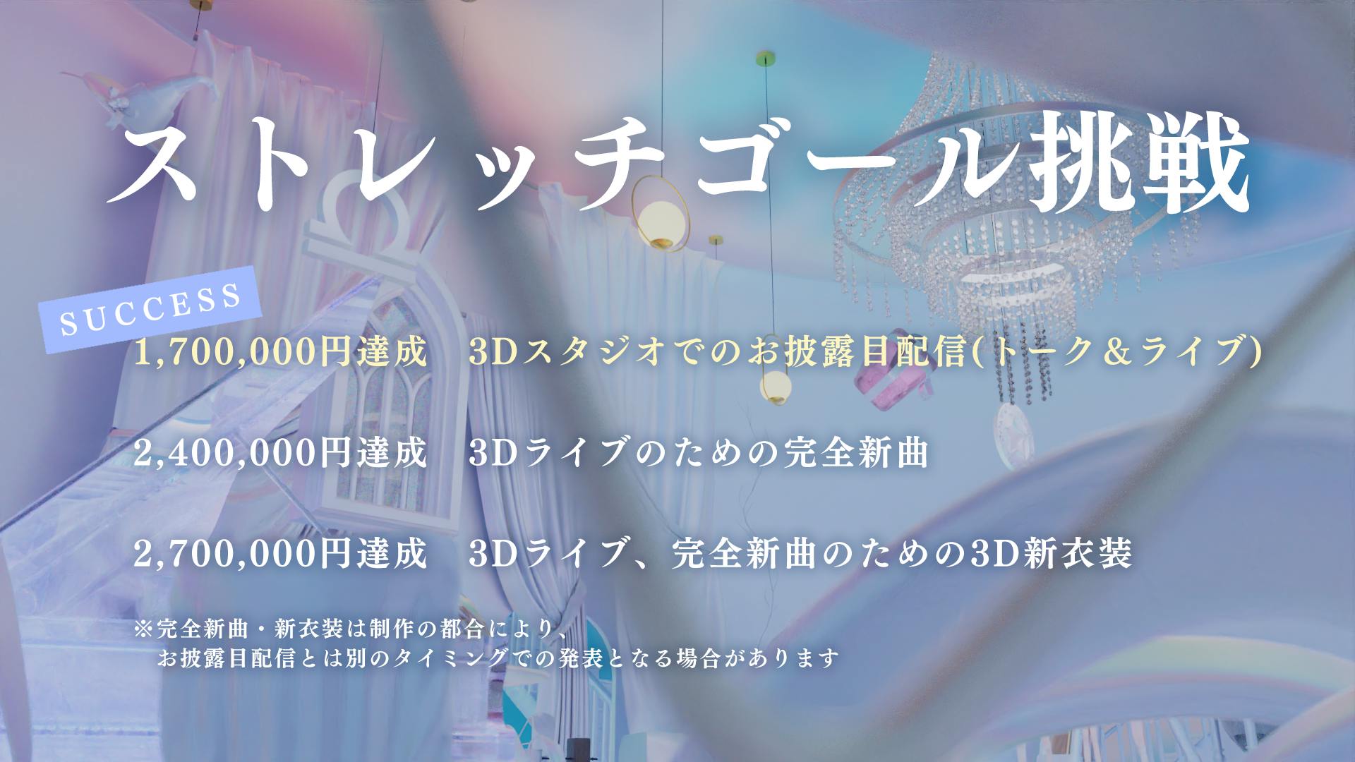 1,700,000円達成で、3Dスタジオでのお披露目配信が決定いたします。お披露目配信では、トークとミニライブを検討していますので、楽しみにしていてください!
