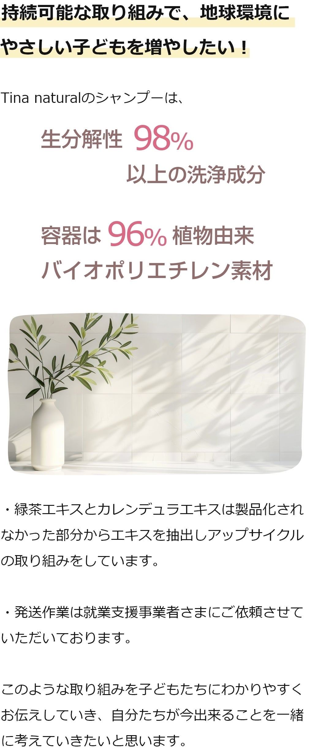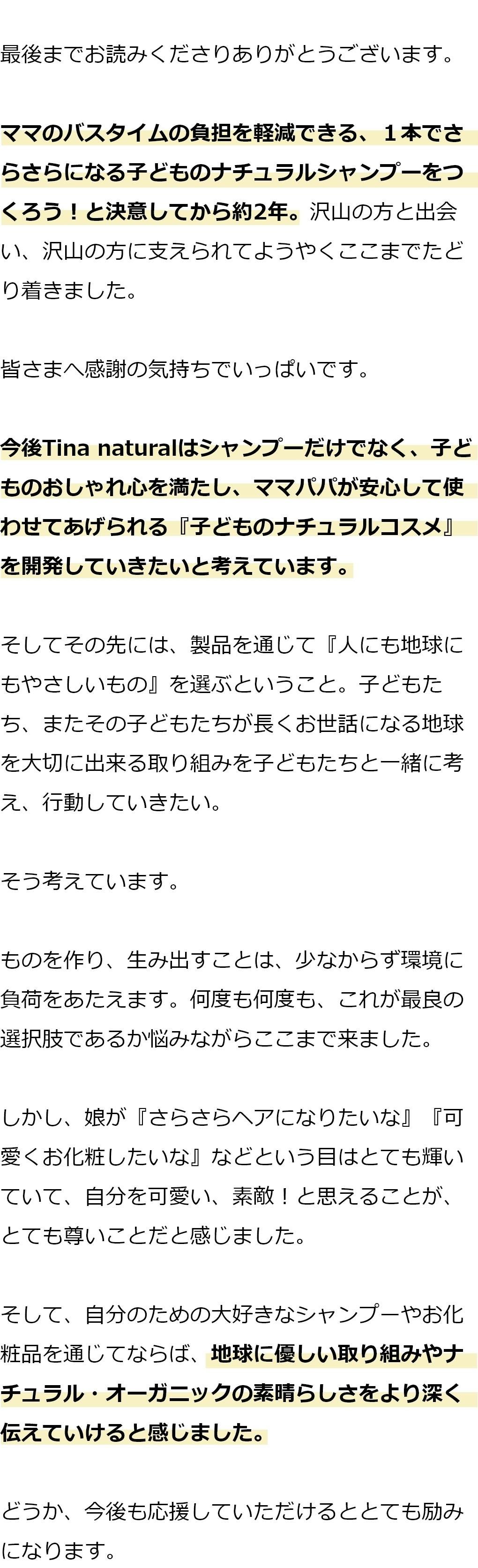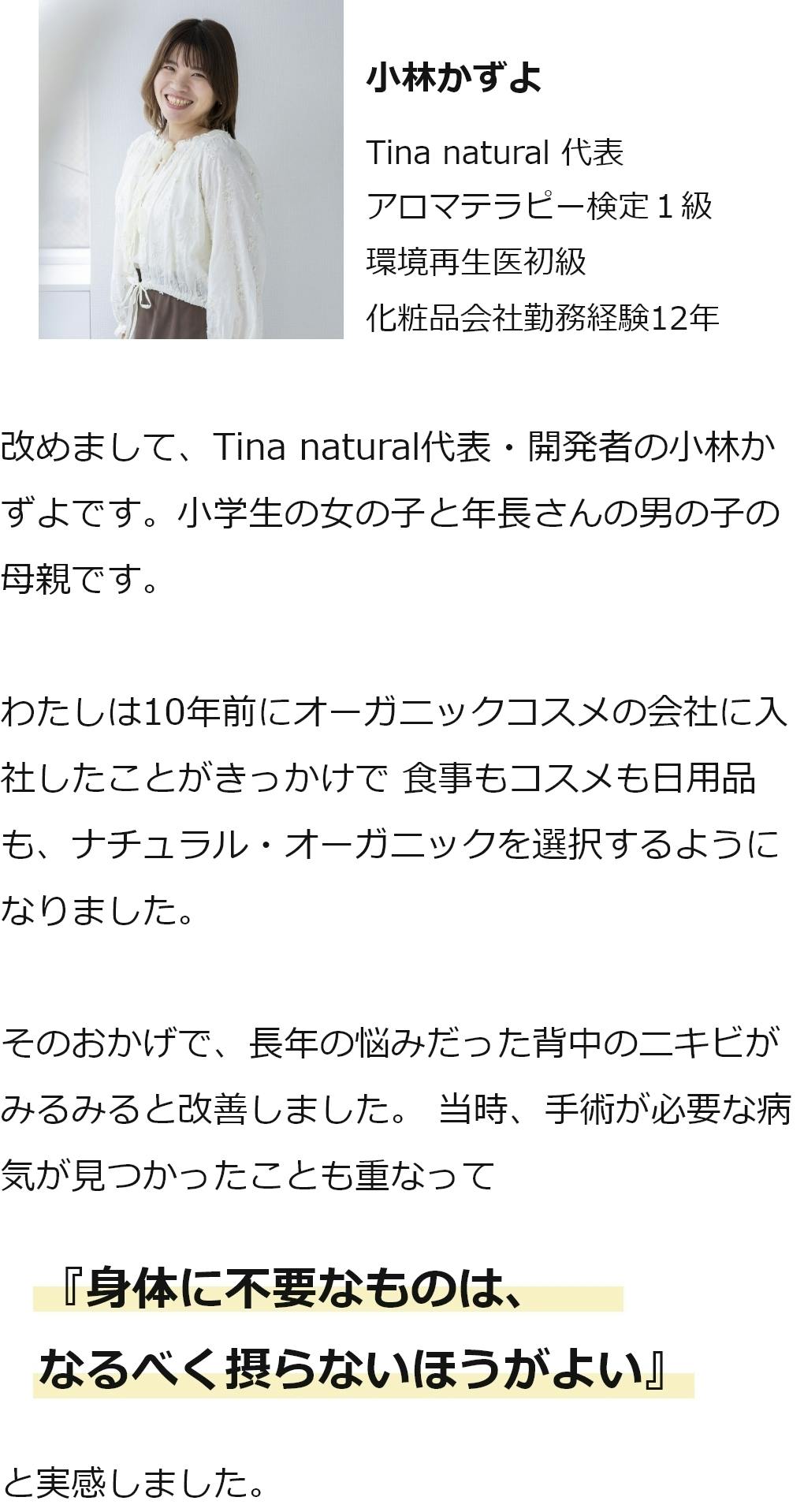 2024/12/24 12:45皆さま、ご無沙汰しております。Tinanatural代表の小林かずよです。本日は、皆さまにECサイトオープン前の先行販売のお知らせでご連絡をさせていただきました。 先日、Instagramで先行販売のお知らせをさせていただいたところ、帰省の際のギフトにご購入してくださった方がいらっしゃいました。 大切な方へのギフトに、Tinanaturalを選んでいただき本当に本当に嬉しいです。まだ間に合いますので、もしよろしければ帰省の際のプレゼントなどにいかがでしょうか。 年内は12月29日までご注文受付、30日が年内最終発送となります。 年始は1月4日より、発送を開始いたします。 商品ご購入方法の詳細は、こちらをご覧くださいませ。 https://drive.google.com/file/d/1KqX35cez6dnNfiDJgXwWnsww0xbHKqAv/view?usp=sharing 《販売概要》■販売価格Tinanaturalナチュラルさらさらシャンプー・300mL(約50回~100回分)【550円OFF】 定価3850円(税込)⇒3300円(税込)・50mLミニボトル 定価1078円(税込)※9900円以上のお買い上げ(300mL×3本相当)で送料無料です。※送料は地域により異なります。必ずご確認ください※キャンペーンは予告なく終了します。ご了承ください。■ご購入方法1.InstagramのDMまたはLINE、クラウドファンディングのメッセージ機能にて直接ご連絡を頂きたくお願いいたします。2.ご購入希望商品、数量、発送先ご住所、お電話番号をお伺いさせていただきます。その後、合計金額とお振込先を指定させていただきますので、所定の口座にお振込みをお願いします。※お振込み手数料はこちらでご負担させていただきます。3.お振込み確認後、翌営業日(土日祝日、年末年始を除く)に栃木県にある倉庫より佐川急便で発送させていただきます。※納品書、領収書をご希望の場合はお申しつけください。メールにてお送りさせていただきます。■送料について【北海道】 1000円【東北】青森、岩手、秋田、宮城、山形、福島 700円【関東】茨城、栃木、群馬、埼玉、千葉、東京、神奈川、山梨 700円【信越】新潟、長野 700円【東海】愛知、岐阜、静岡、三重 700円【北陸】富山、石川、福井 700円【関西】滋賀、京都、大阪、兵庫、奈良、和歌山 700円【中国】鳥取、島根、岡山、広島、山口 800円【四国】徳島、香川、愛媛、高知 900円【九州】福岡、佐賀、長崎、大分、熊本、宮崎、鹿児島 1000円【沖縄】1500円■特定商取引法に基づく表記事業者の名称 Tina natural (ティナ ナチュラル)代表者 小林和代事業者の所在地〒150-0002東京都渋谷区渋谷2-19-15宮益坂ビルディング609事業者の連絡先 03-6363-5678営業時間などお問い合わせ対応時間:11:00~16:00定休日:不定休■個人情報保護方針個人情報の保護に関する法律その他の法令を遵守し個人情報を適切に取り扱います。個人情報の取得にあたっては、その利用目的を特定することとし、特定された目的の達成に必要な範囲を超えた個人情報の取扱い(目的外利用)はいたしません。また、目的外利用を行わないために、適切な管理措置を講じます。個人情報の取扱いに関する苦情又は相談を受けた場合、その内容について事実関係等を調査し、迅速に対応いたします。個人情報の漏えい、滅失またはき損等の危険に対し、技術面及び組織面において合理的な安全対策、防止措置を講じます。では、皆さま素敵なクリスマスをお過ごしください。 もっと見る