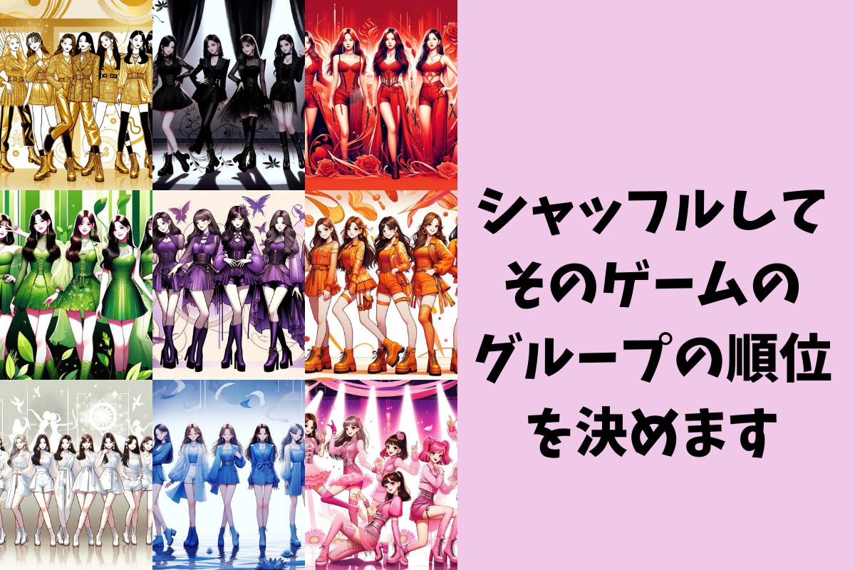 シャッフルして伏せた状態の「アイドルグループカード」9枚を、上から順番にめくっていき、ランキング1位から9位まで決めます。