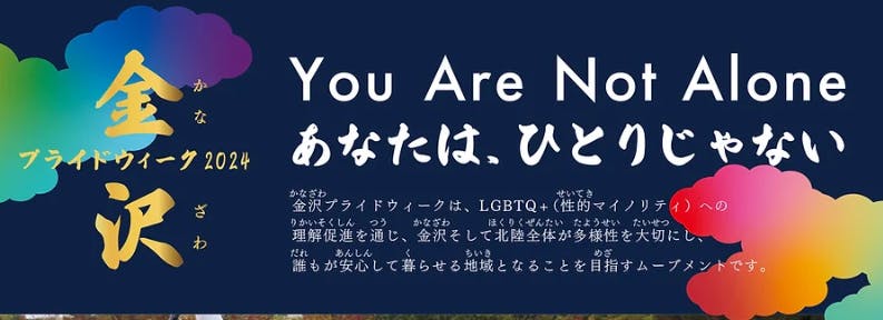 金沢プライドパレード2024は、「You Are Not Alone あなたは、ひとりじゃない」をテーマに、しいのき緑地および金沢市内で開催されます。
