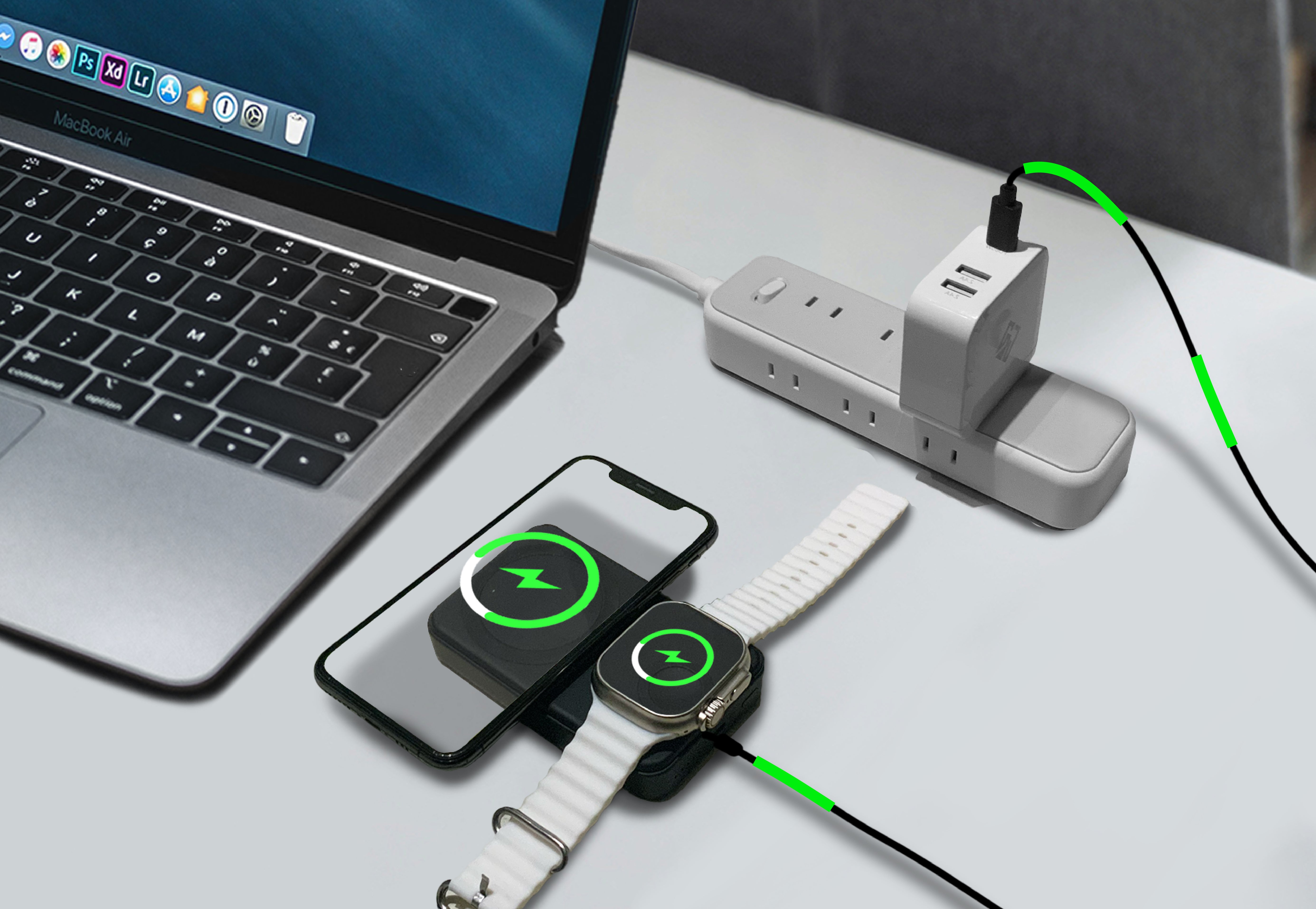 デバイスの充電には、最大3台同時充電に対応可能なハイエンドモデル。ワイヤレス充電に対応していない端末への充電や、バッテリーのシェアにも役立ちます。