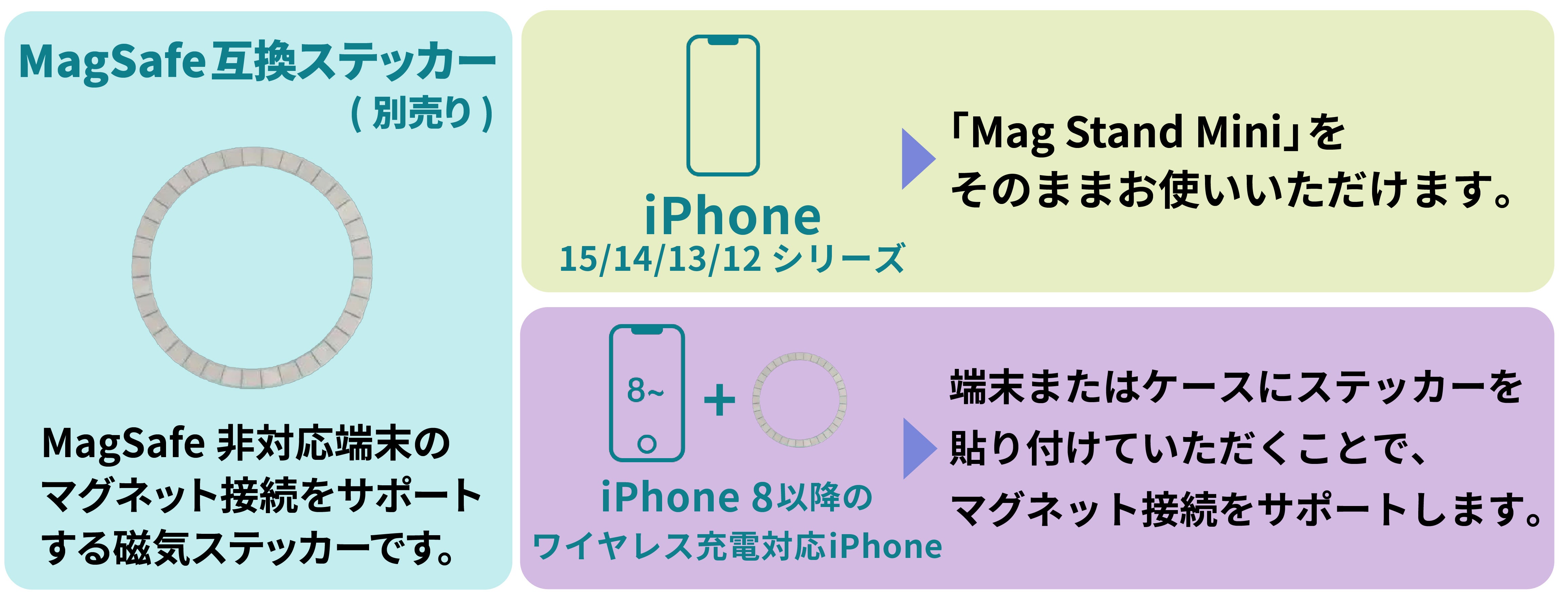「Mag Stand Mini」はワイヤレス充電に対応した各種デバイスに対応。MagSafe対応端末または、MagSafe対応ステッカー等をご使用の場合は強力なマグネット接続をご使用いただけます。