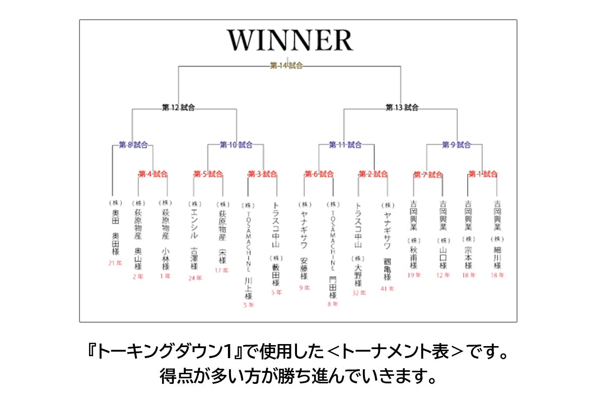 トーナメント制で全14試合行い、公平に審査を行う為に、<採点表>は営業トークをされるセールスが所属している会社以外の会社様に審査していただき、勝者を決定いたしました。