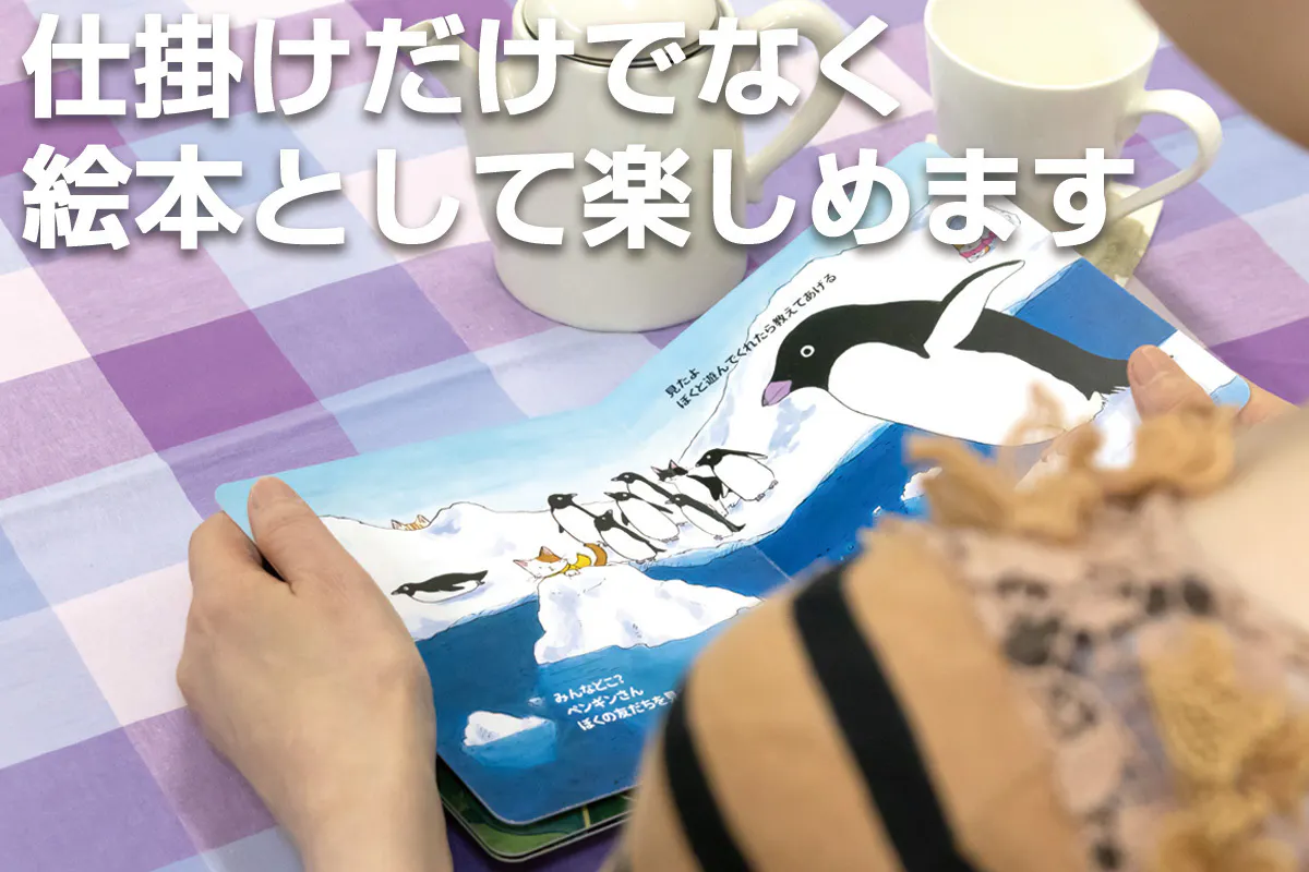 仕掛け絵本にねこたちが楽しく遊ぶ工夫をプラスしました。