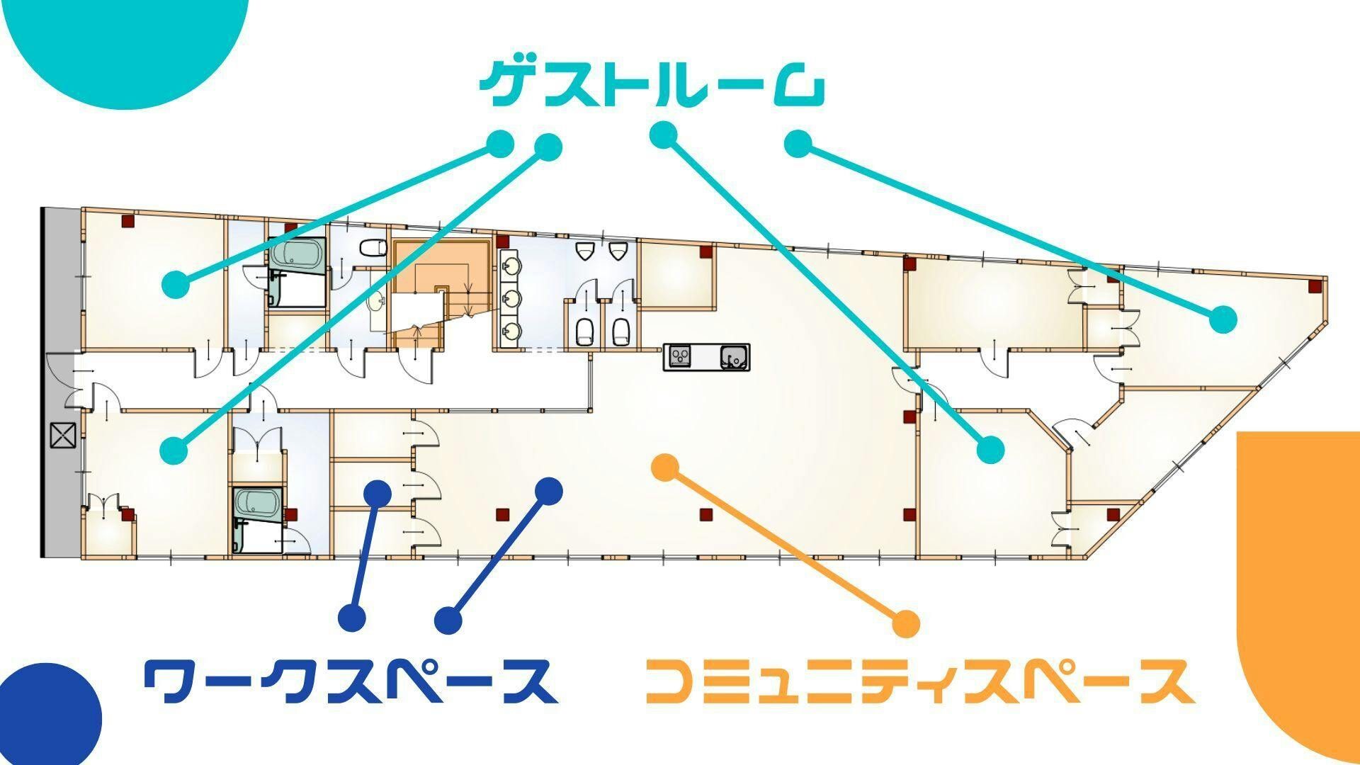 施設は「ゲストルーム」「ワークスペース」「コミュニティスペース」の3つの機能を有しています。