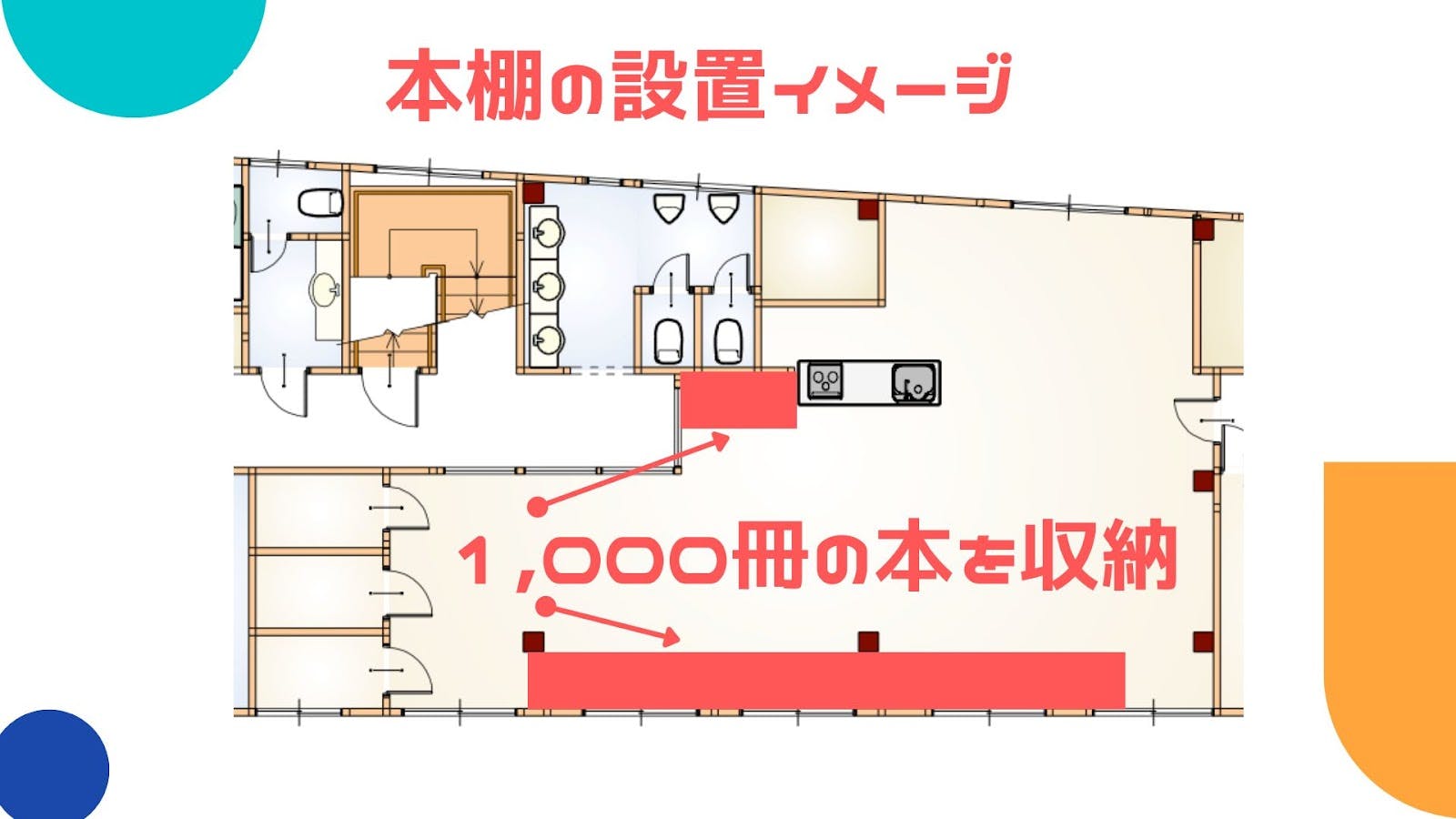 本棚はDIYで制作し、コミュニティスペース内に設置。約1,000冊の本を収納する予定です。