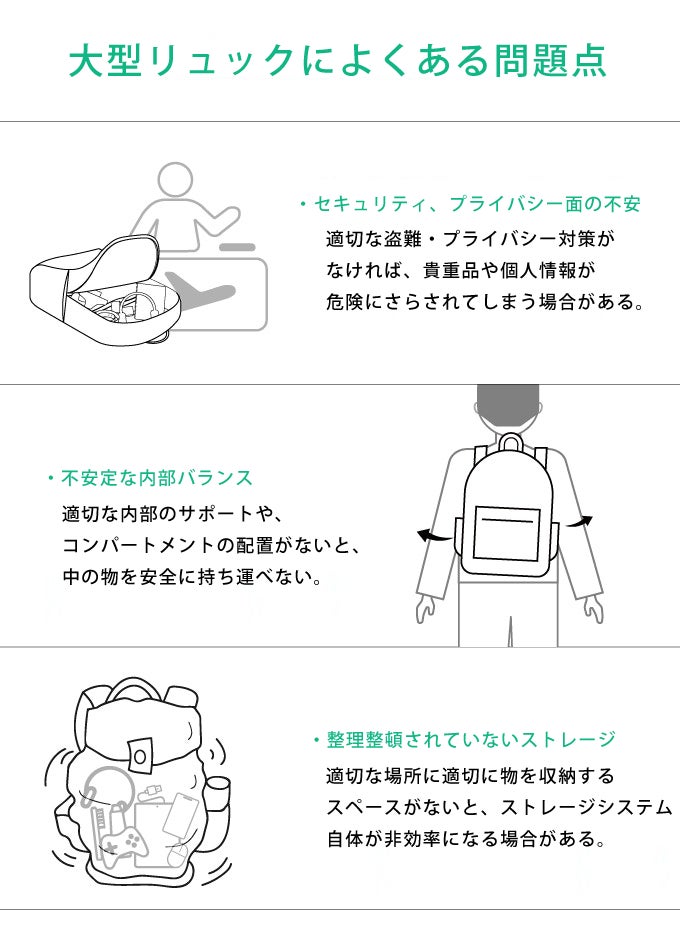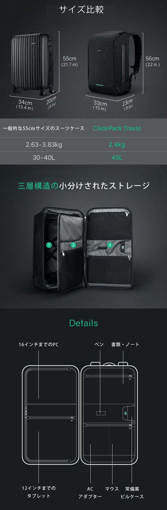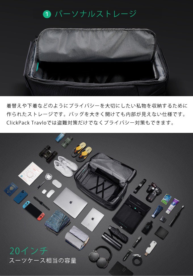 Clickpack Travlo は、大型リュックによくある問題点を解決し、より荷物を入れやすい設計にアップグレードしています。バッグの中は三層構造で、パソコンや着替えなど仕事と私物を仕分けでき、プライバシー対策もできます。このデザインによって荷物が整理整頓でき、簡単に出し入れしやすくなりました。