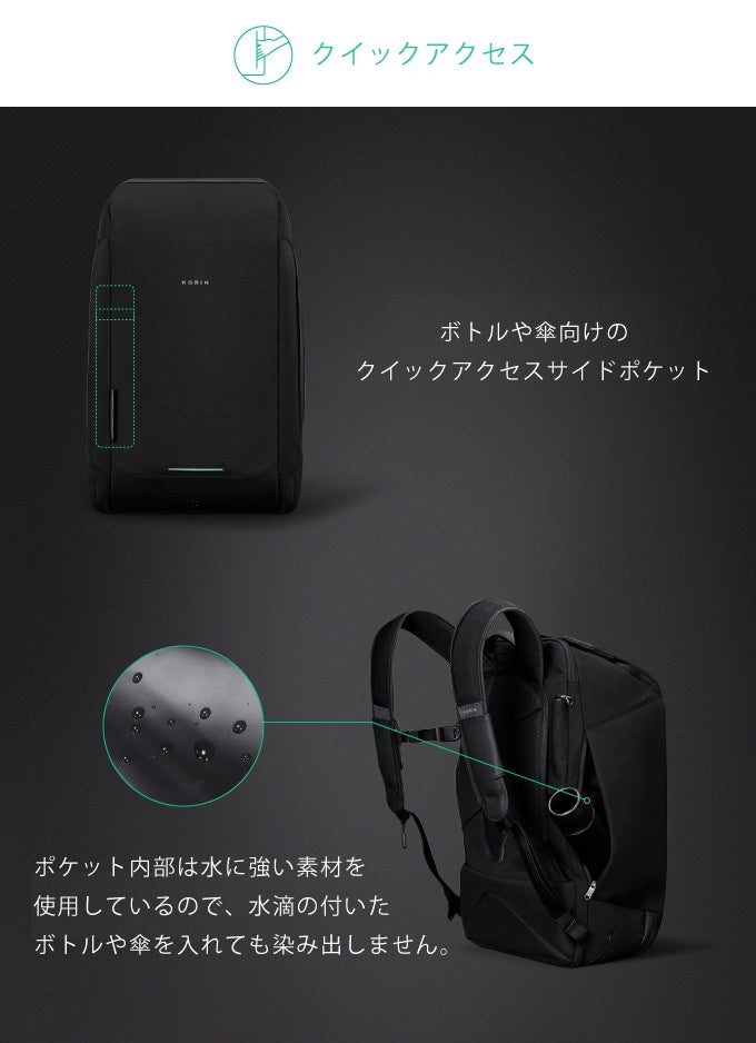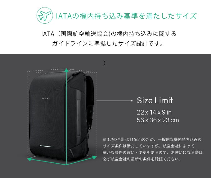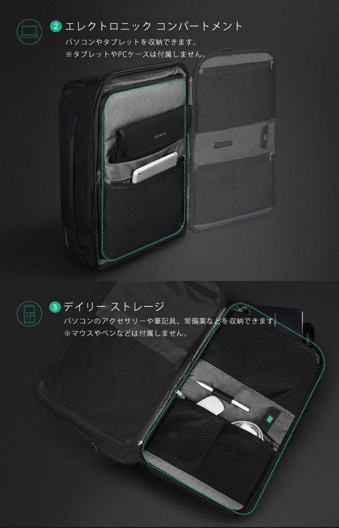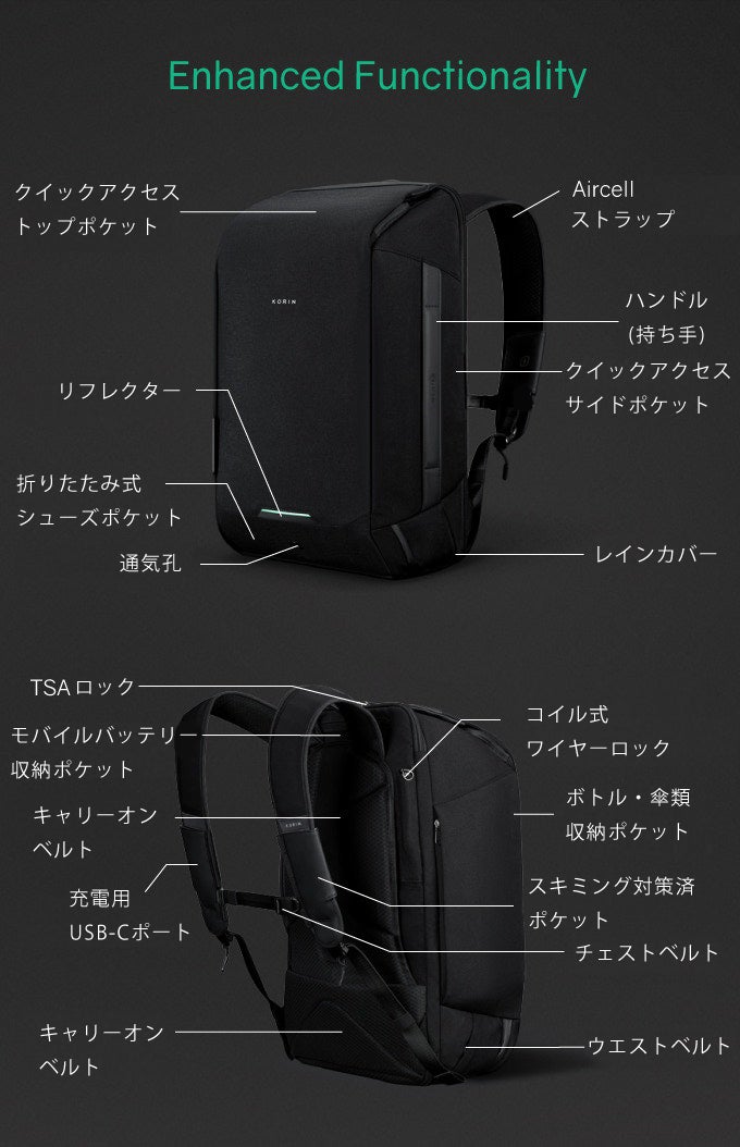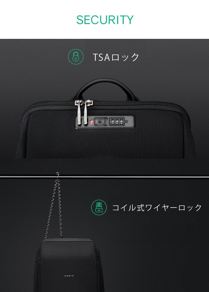 【安全安心を担ぐ防犯対策バックパック】という基本コンセプトはそのままにClickPack、FlexPack、HiPack、FlipPack、ClickPack X、SnapPackなど、今まで大変ご好評頂きました。TSAロック、ワイヤーロック、充電用USBポートといった、Korinだからできるアイデアを45Lのデカリュックに余すことなく詰め込んだ集大成となります。