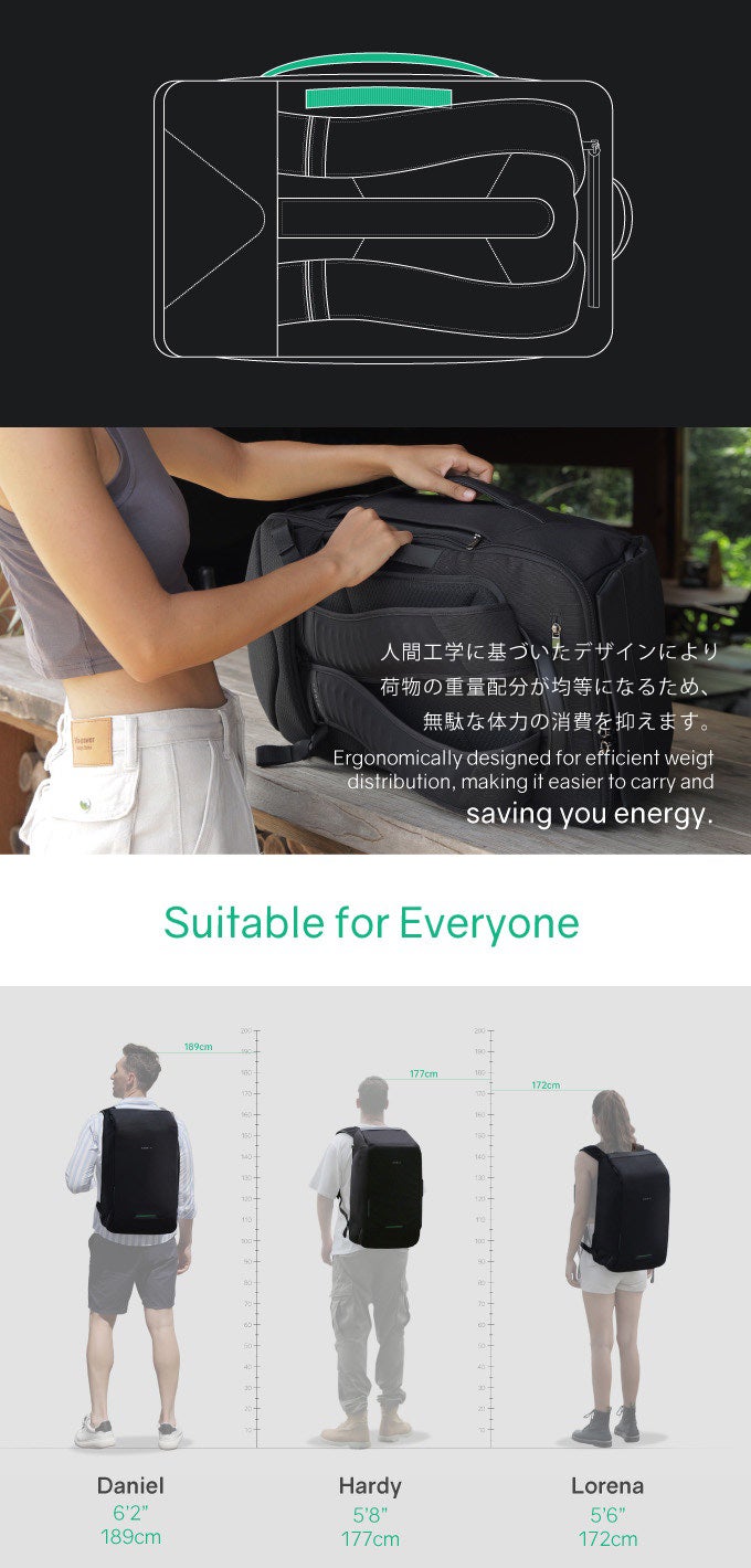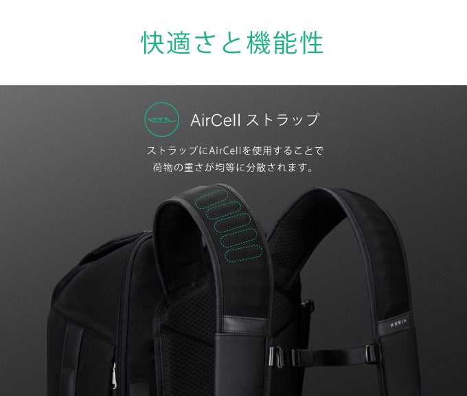 過去最大容量の45L 、約一週間分の荷物を収納できます。スーツケースのように三層構造で仕分けができ、TSAロック・ワイヤーロック・不正開閉防止ファスナーの3重セキュリティで防犯対策はバッチリ!さらにストラップはAirCellを使用しているので、荷物の重さが均等に分散されて背負いやすいです。 重たい荷物を手に持たなくていいので、ストレスフリーな移動時間を過ごせます。