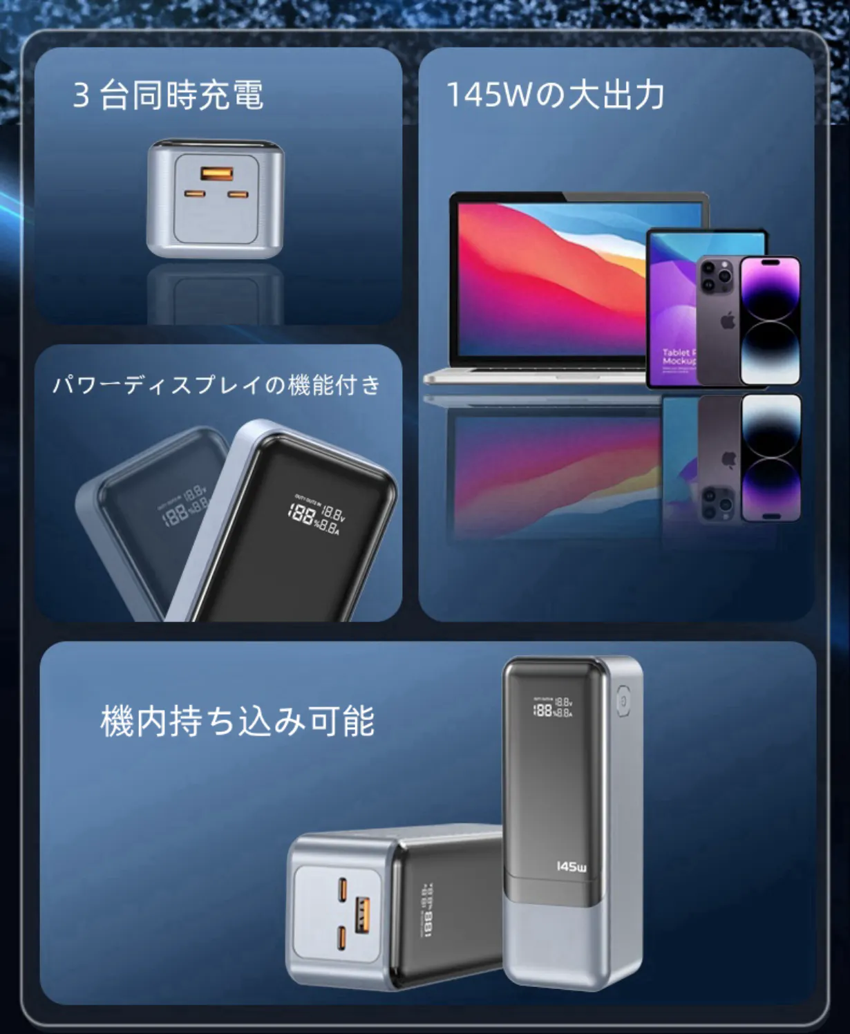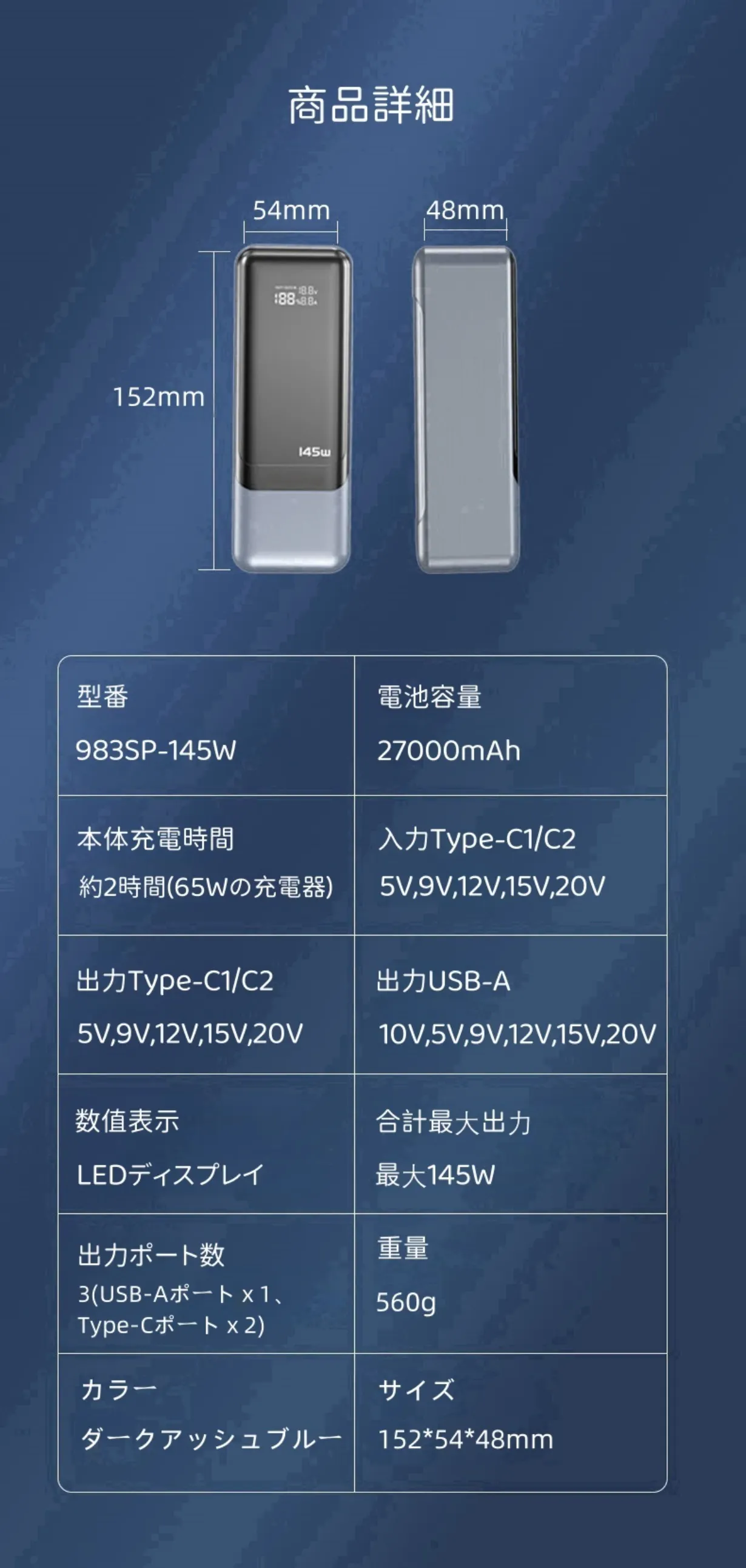 アウトドアでの活動をより快適に、安心して楽しむために、大容量の27000mAhバッテリーを搭載したポータブル電源を開発しました!この製品は、最大出力145Wを誇り、単ポート利用時でも最大100Wの出力を実現します。また、LEDデジタルインジケーターを搭載し、電力残量、電圧、および電流をリアルタイムで確認できるので、使いやすさも抜群です。
