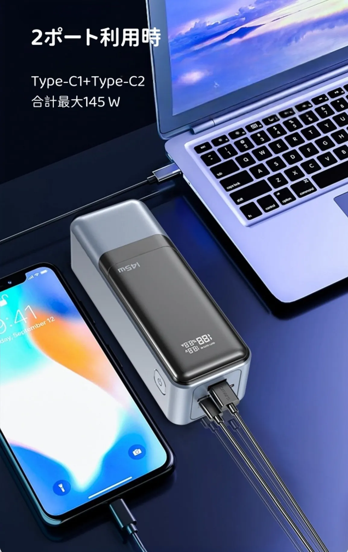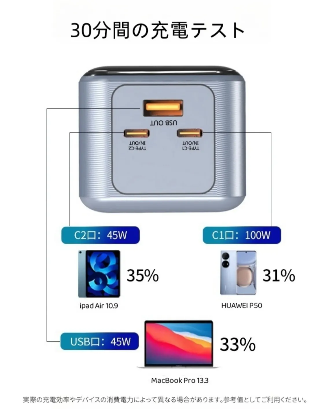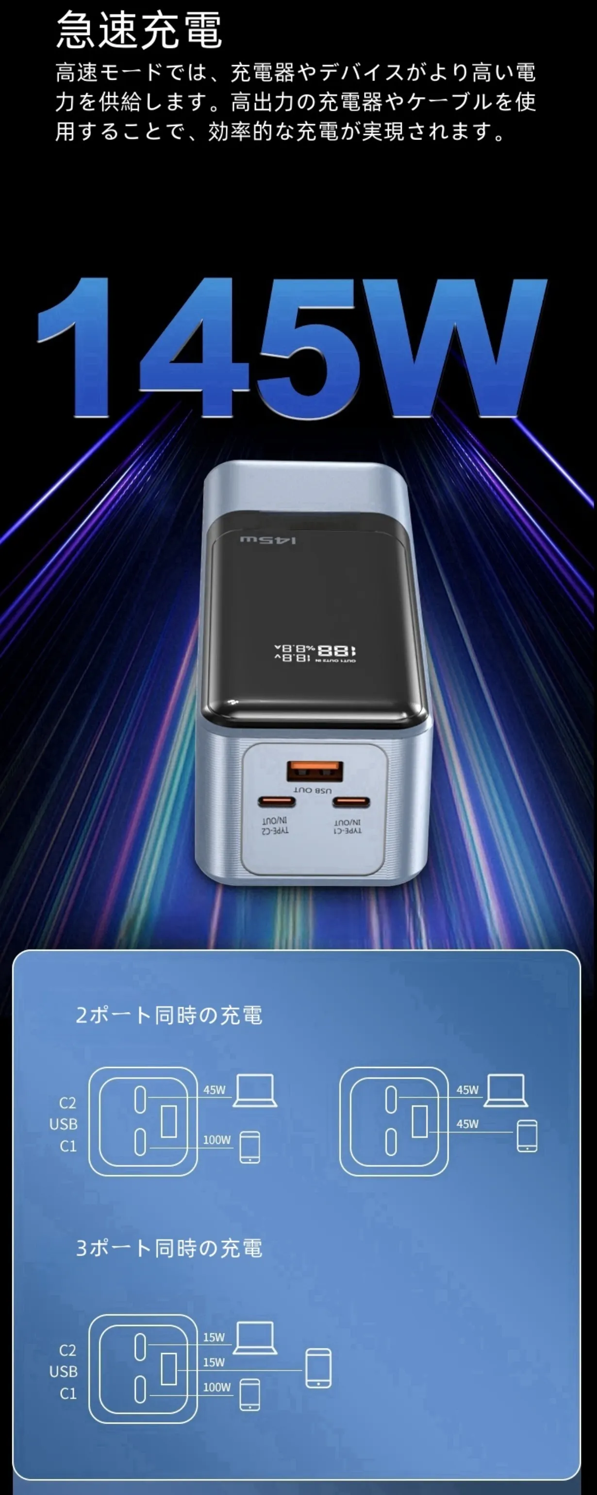 1. Type-C1とUSB出力の組み合わせでは、最大100Wと45Wの電力を供給することができます。