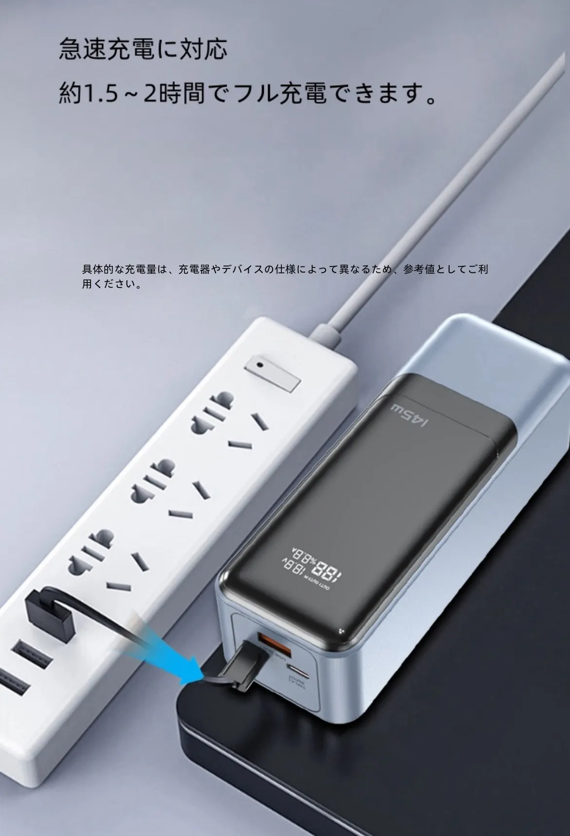 バッテリー本体の充電時間を大幅に短縮できます。これにより、待ち時間を大幅に短縮し、より迅速にデバイスの充電を開始することができます。