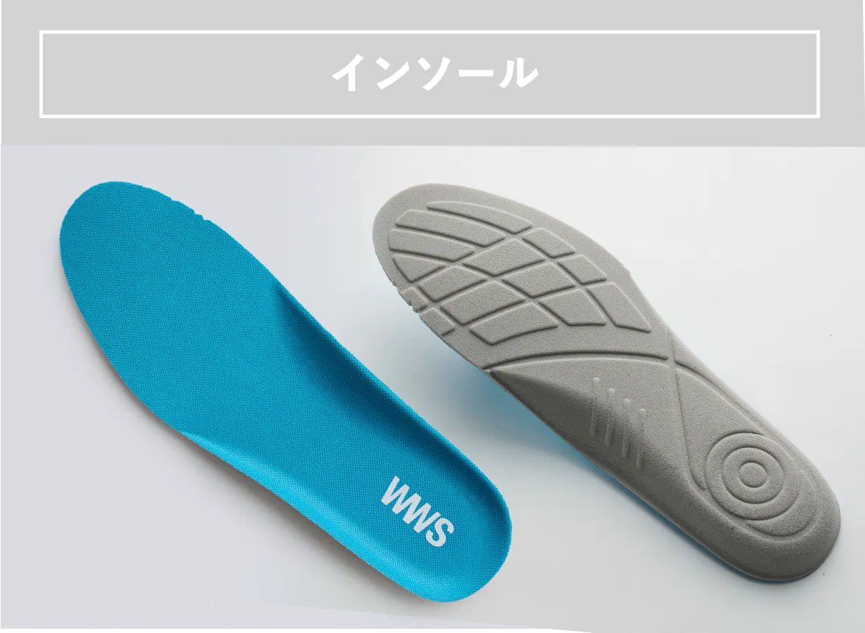 インソールは高機能のEVAフォームを使用。歩行時の衝撃を驚くほど吸収し、膝や腰への負担を軽減するのと同時に履き心地の快適さを実現します。