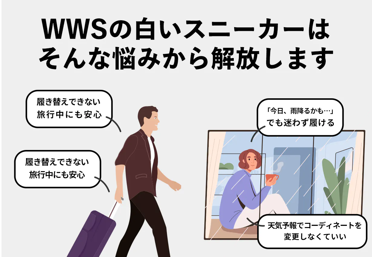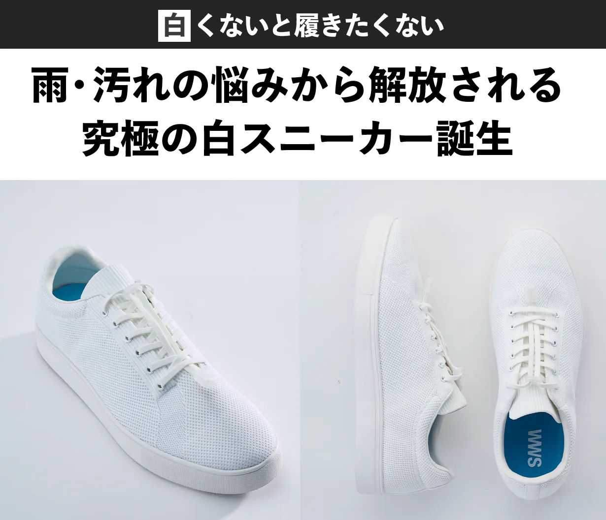 WWSが次に挑戦したのは“どんな天気でも安心して履けて、1日中快適に過ごせる”究極の白スニーカー。履きやすい、脱ぎやすい、歩きやすい、洗濯機で洗えてすぐ乾き、白さをキープするのが楽。それでいてスニーカー好きな方に喜んでいただけるカッコよさ。