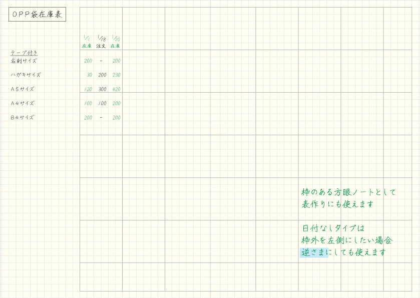 こちらは左側に方眼のフリースペースが来るようにして、在庫管理表にする使い方です。